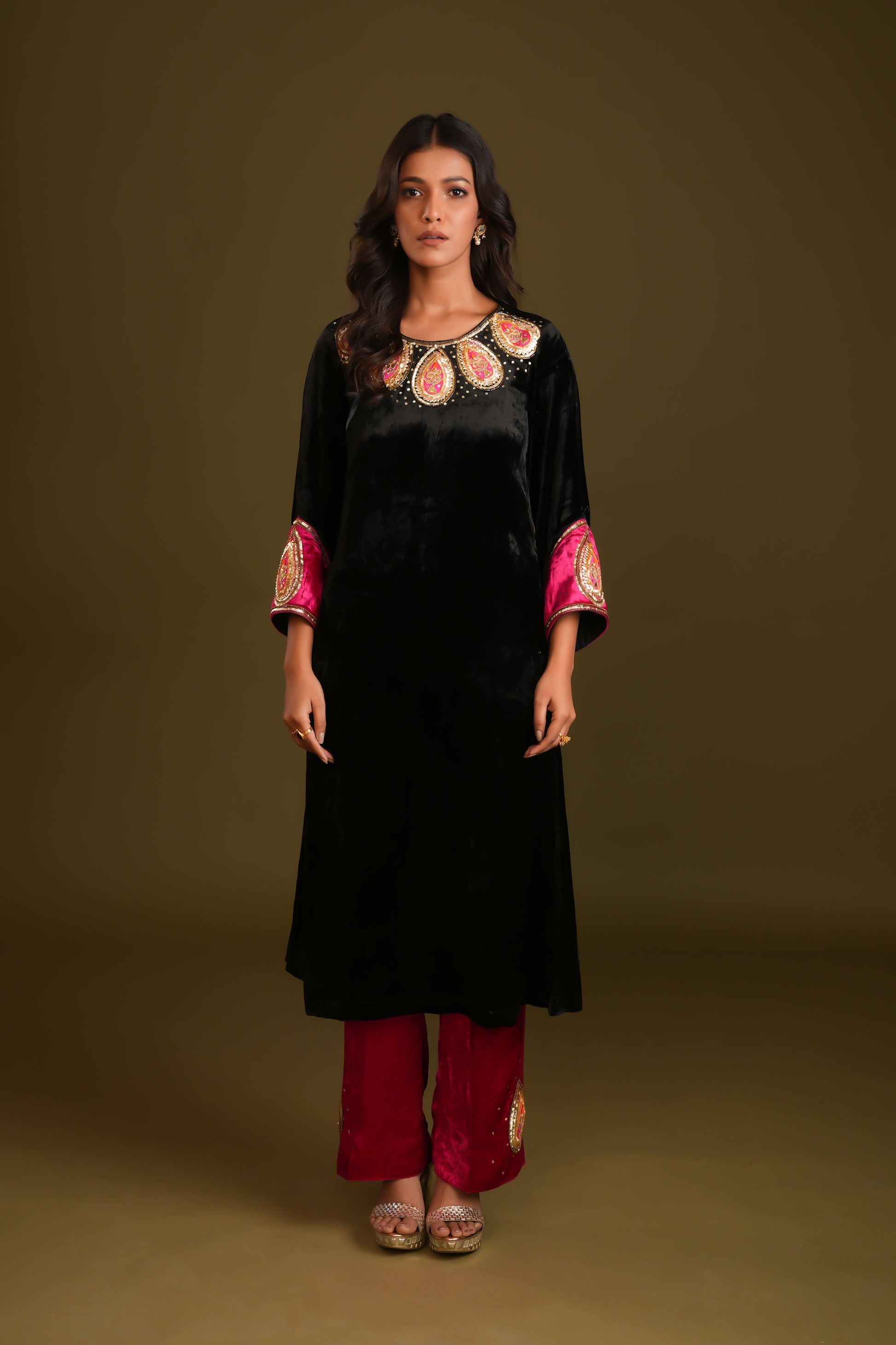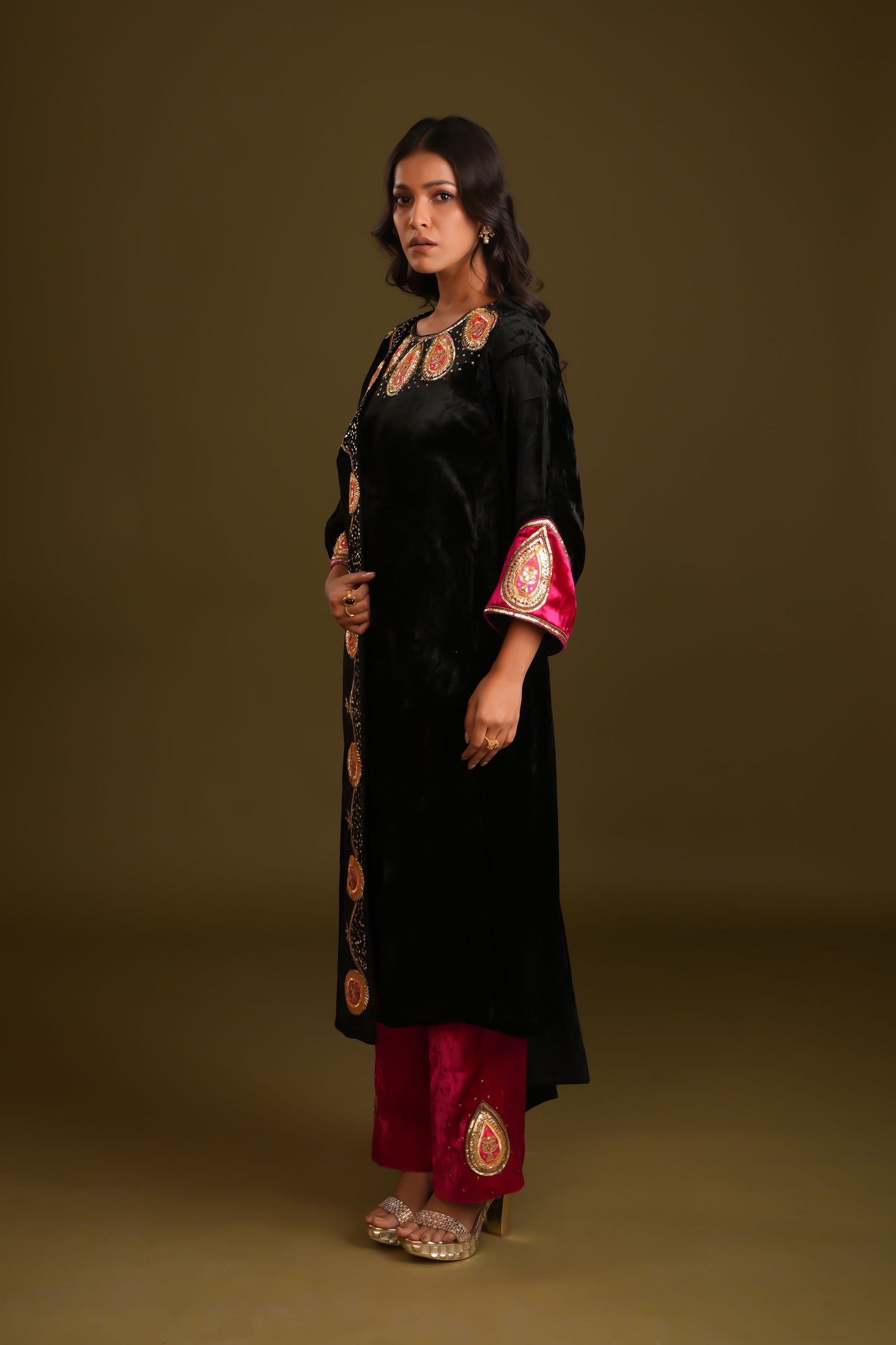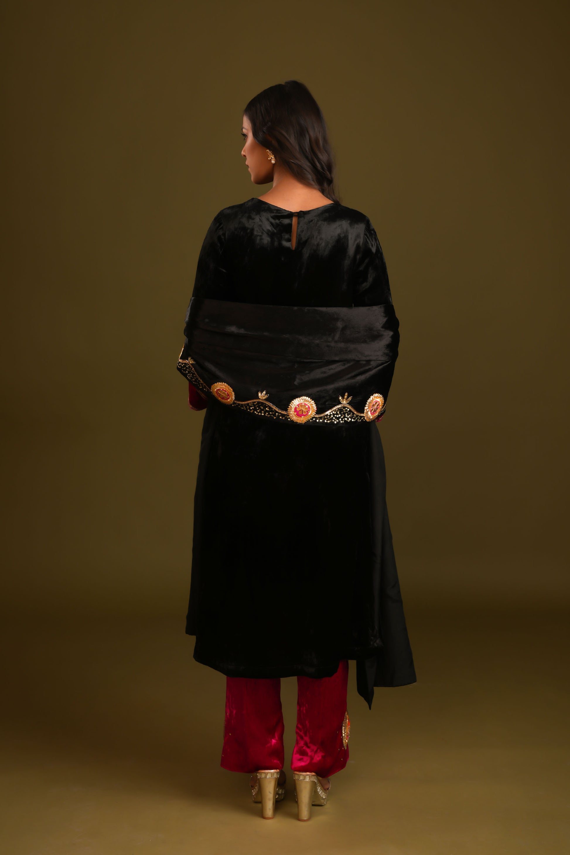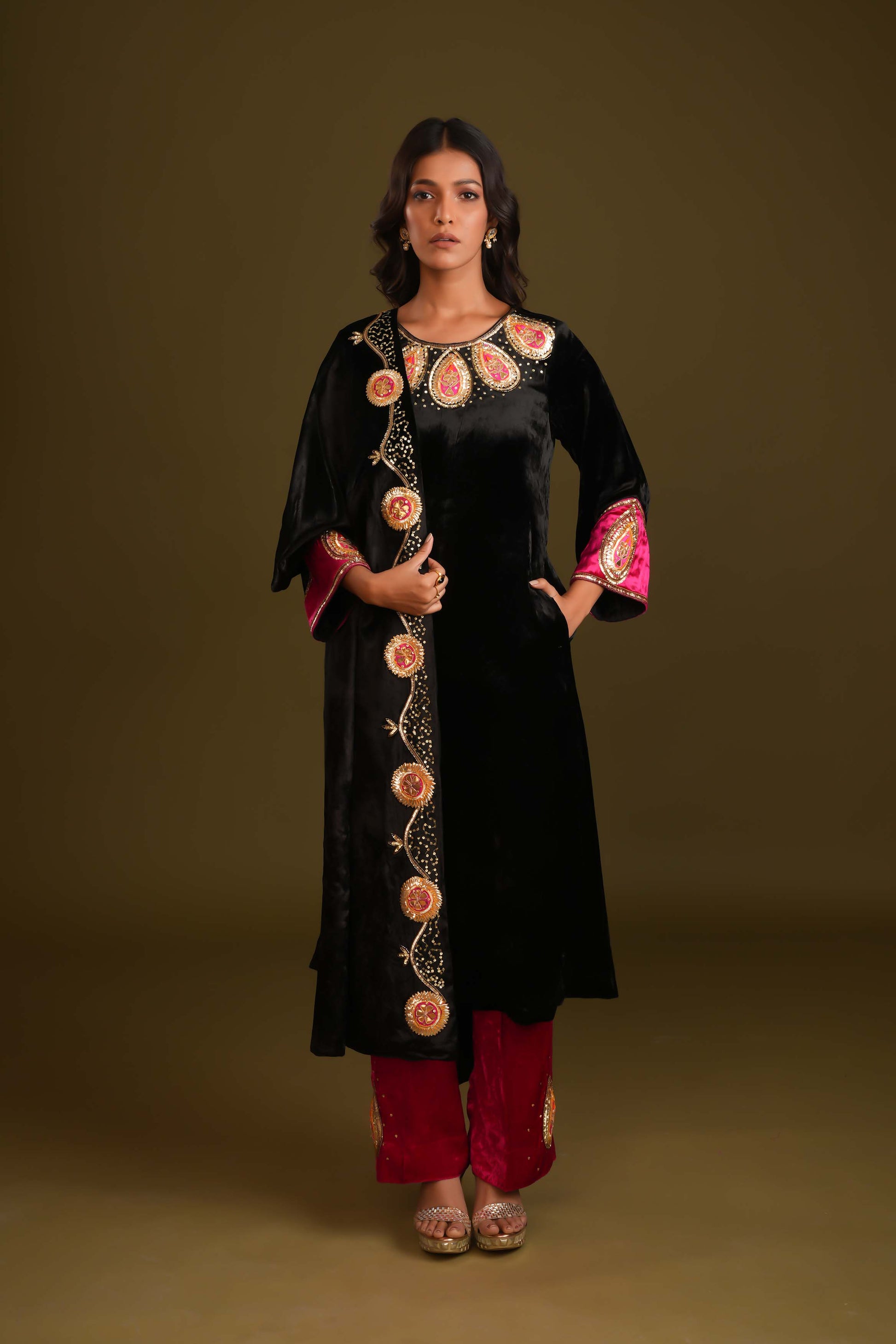 This stunning black velvet suit paired with vibrant rani pink pants strikes the perfect balance between elegance and bold style. Adorned with intricate hand embroidery, the suit exudes sophistication, while the vibrant contrast of colors adds a modern edge. The ensemble is completed with a classy stall-style shawl, featuring unique hand-embroidered detailing on one edge, setting it apart from traditional shawls. Perfect for special occasions, this outfit blends timeless charm with contemporary flair.