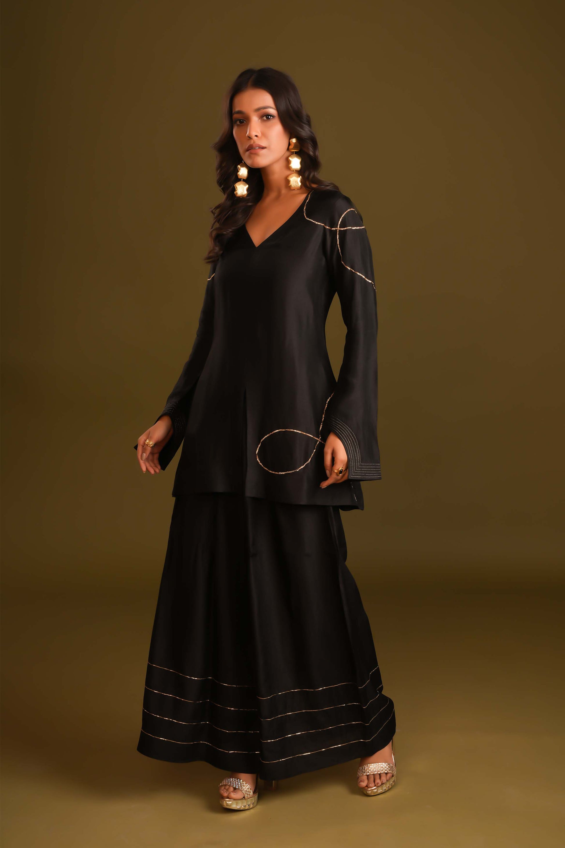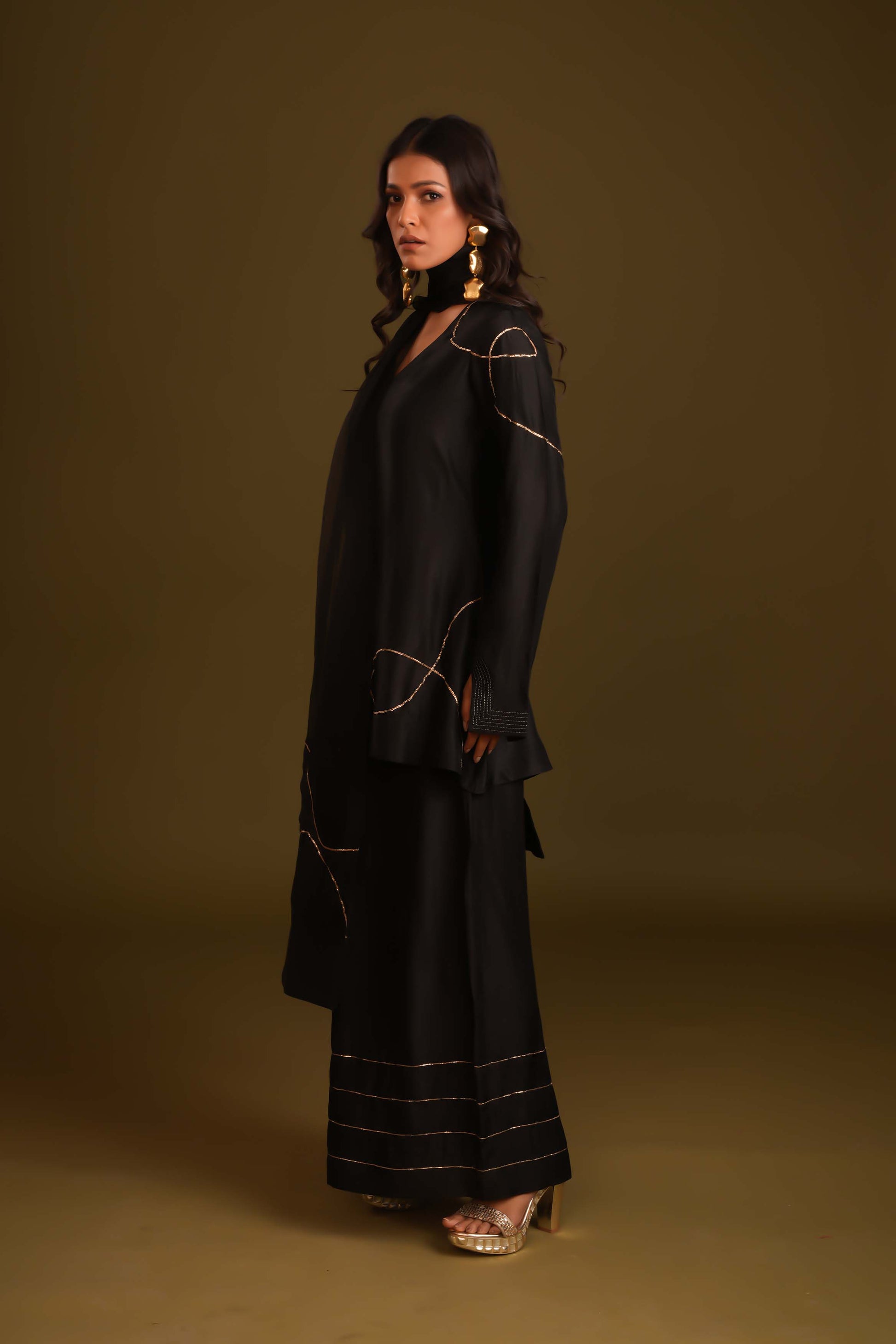 Embrace contemporary style with a traditional twist in this stunning fusion outfit. The shirt-style tunic offers a chic, modern look, while the very wide-leg plazo adds a dramatic flair, creating a graceful silhouette. The ensemble is beautifully accented with statement pitta handwork, adding intricate detailing that elevates the design. Paired with a luxurious organza stall-style dupatta featuring a silk patch, this outfit combines elegance, comfort, and bold style—perfect for making a memorable statement at any event.