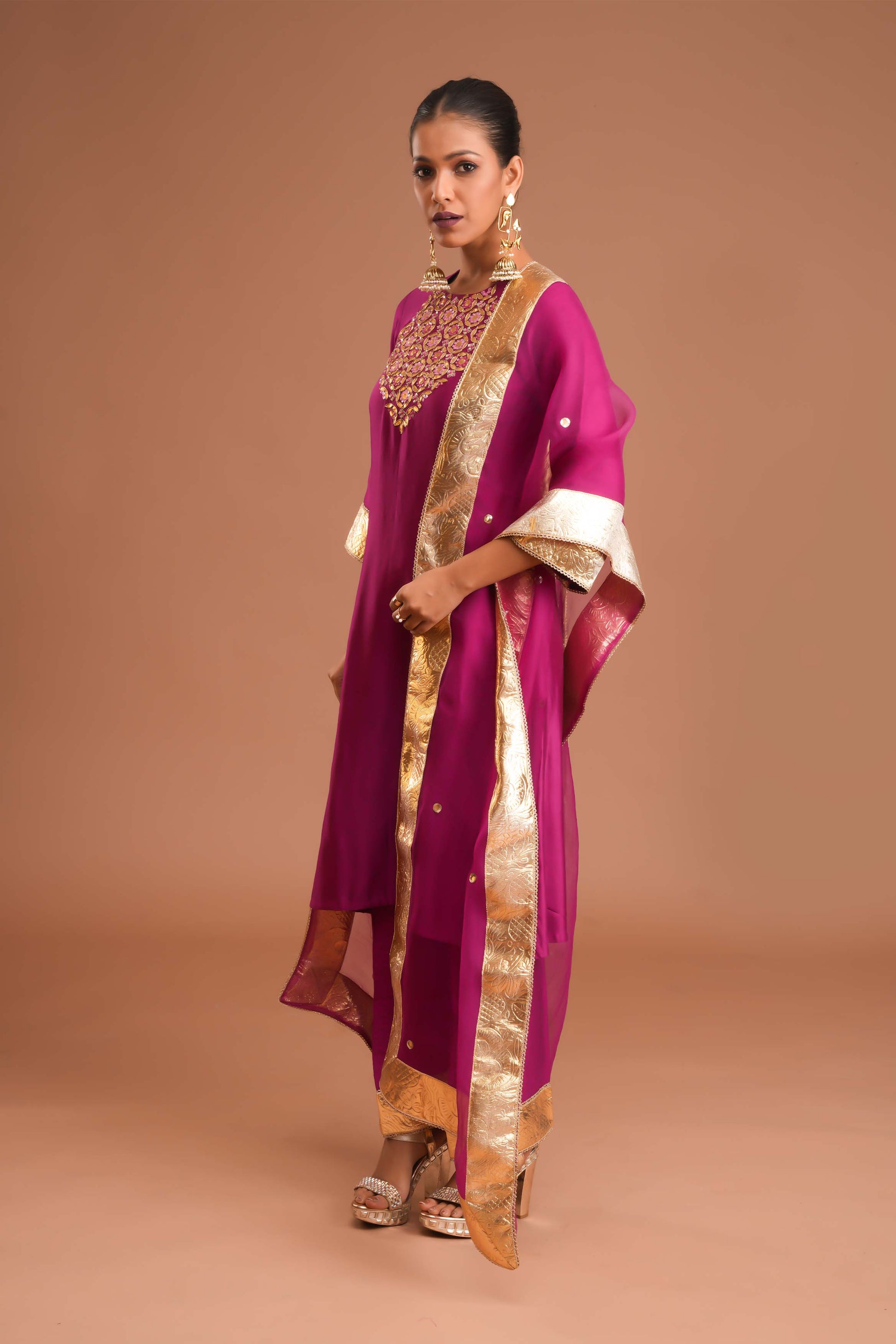 This elegant burgundy suit set combines simplicity with grandeur, featuring intricate hand thread embroidery that gives it a rich, heavy look. Paired with a lightweight organza dupatta adorned with a classic gota border, this ensemble strikes the perfect balance between understated charm and refined sophistication. Ideal for festive occasions and celebrations, it’s a timeless addition to any wardrobe.