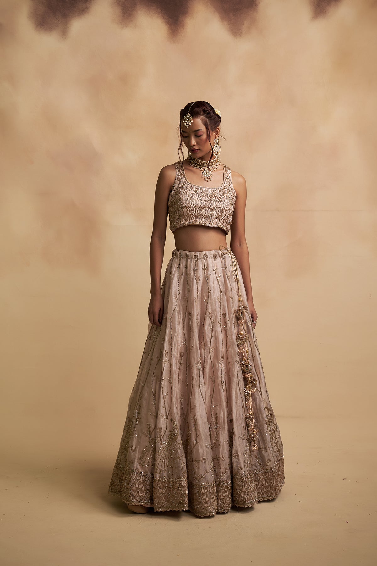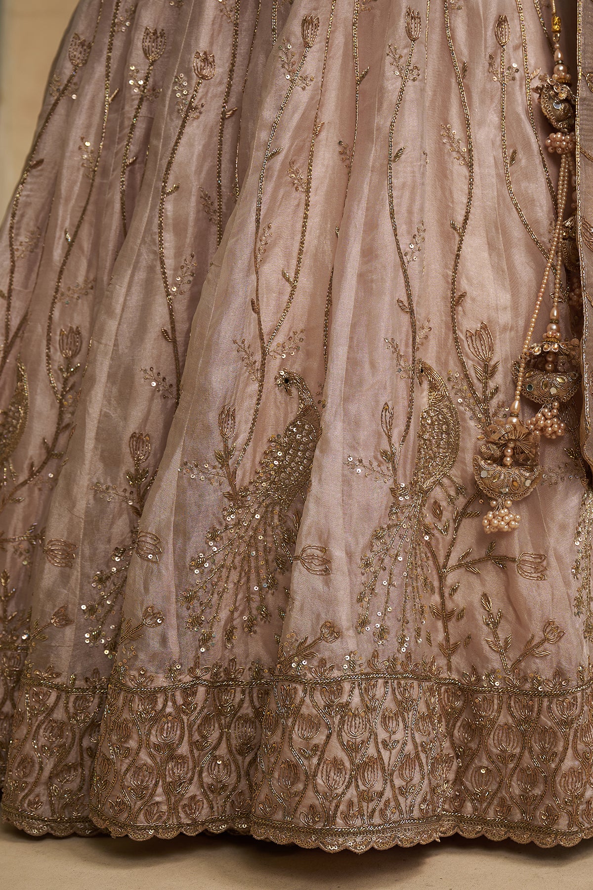 This Tissue silk lehenga has delicate embroidery with detailed peacock motifs on the lehenga and dupatta. The lehenga comes with 20 kali ghera along with the blouse that has detailed and intricate design all over. Dupatta is made of pure crushed tissue silk with scattered sequins work, handwork detailing. Note: All our dresses come with inner linings or slip or underskirt as may be applicable.