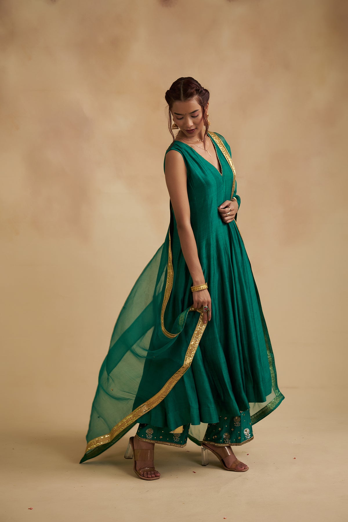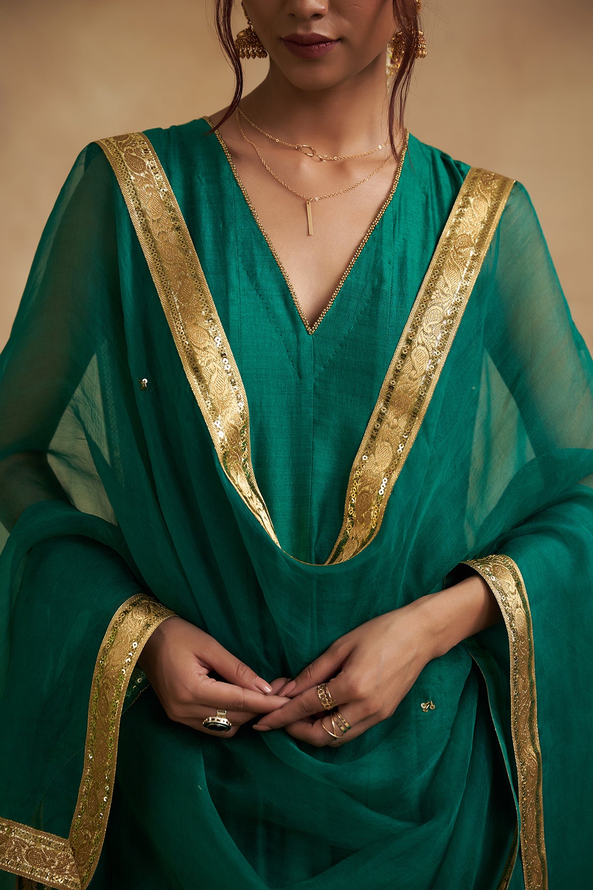 This Chiniya silk suit has delicate embroidery along the neckline and on pants with Dabka and Zari handwork detailing. Dupatta is made of pure Organza with scattered sequins work and kiran lace detailing. Note: All our dresses come with inner linings or slip or underskirt as may be applicable.