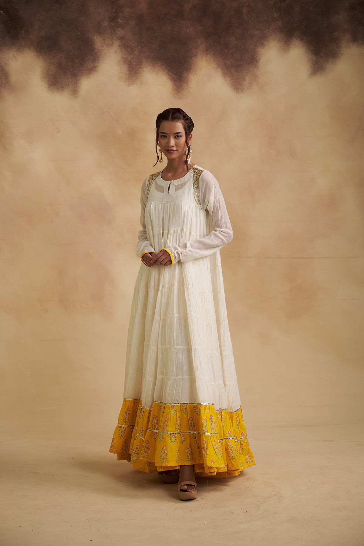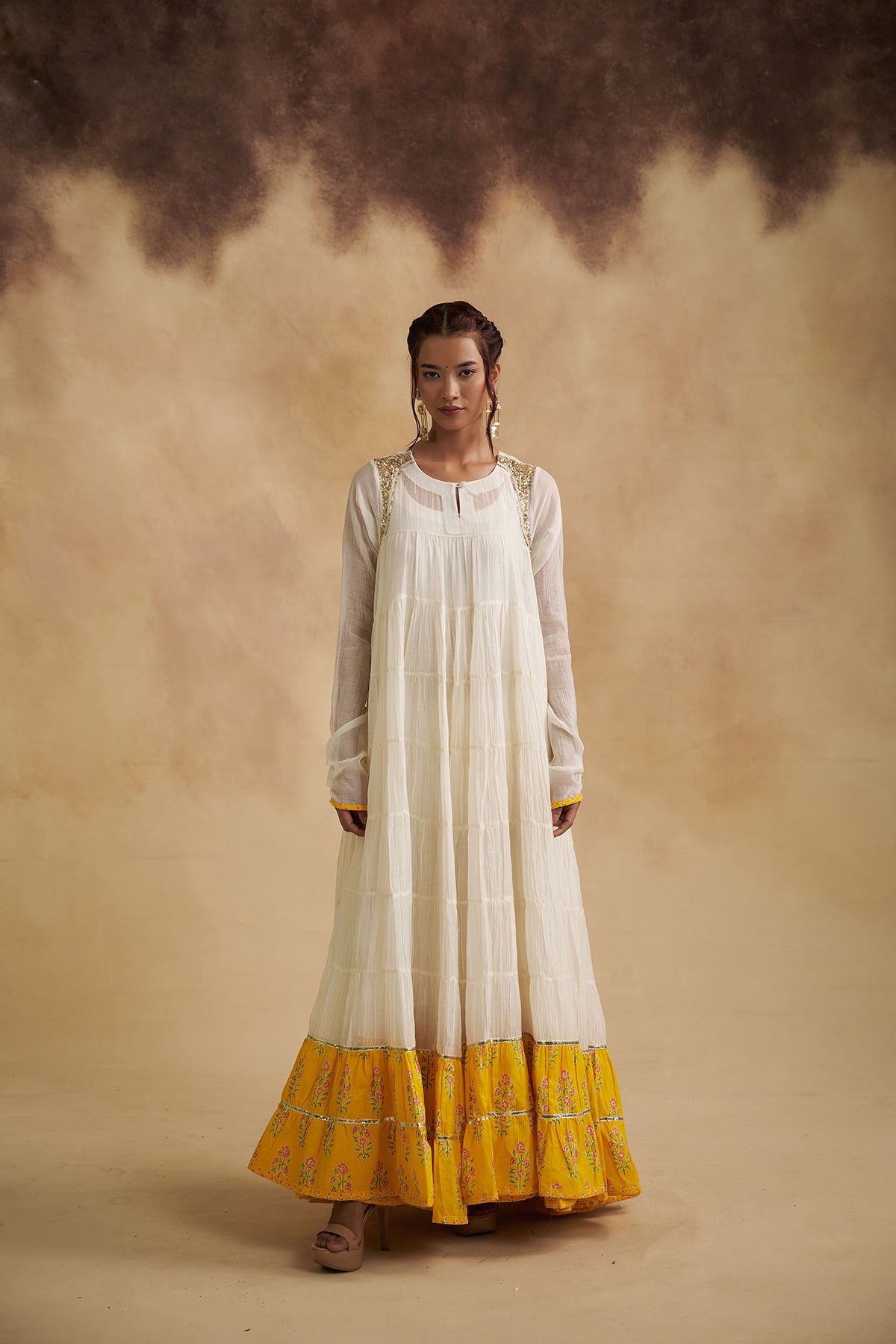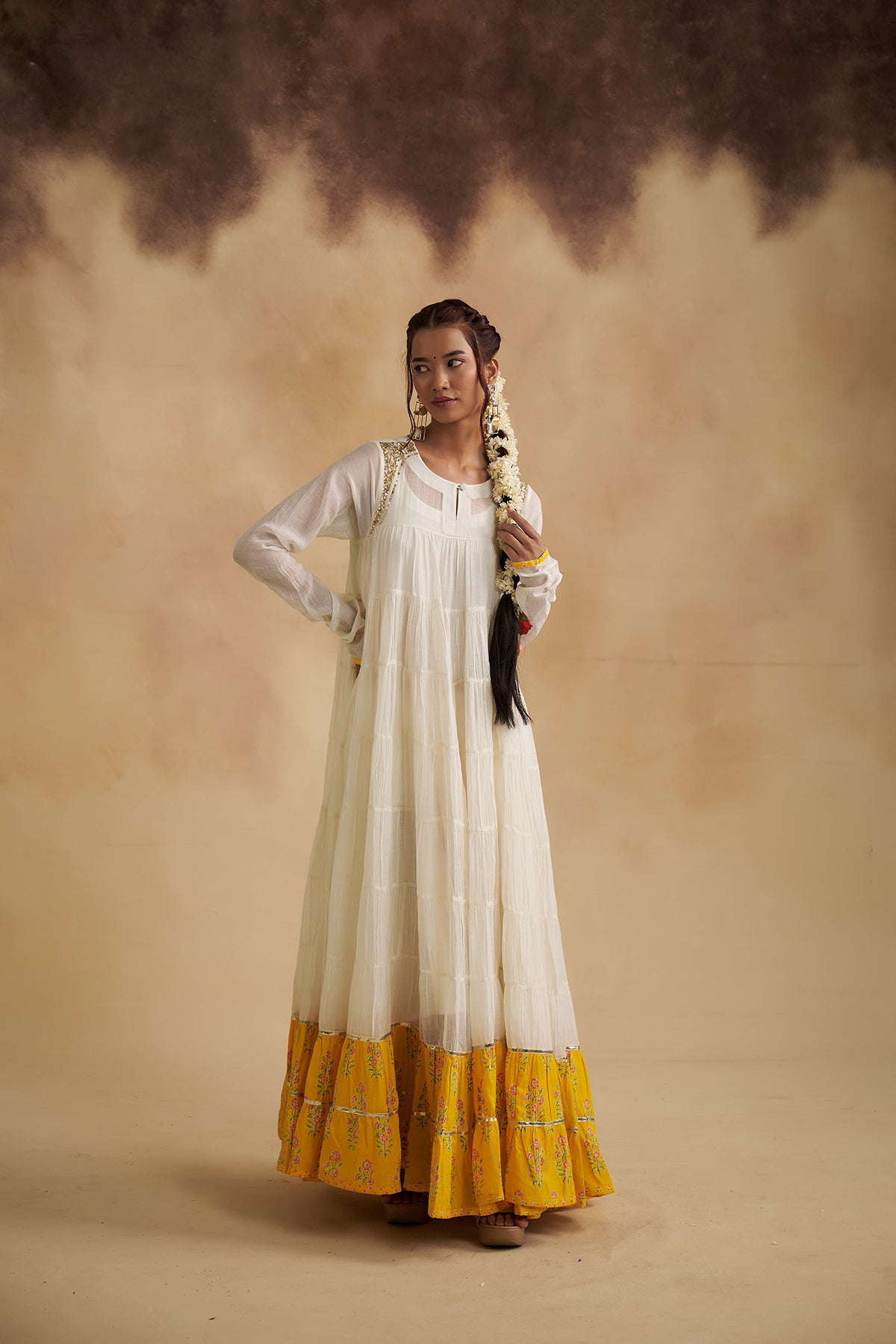 This piece is a multi tiered, pleated, ankle length dress with detailing of sequins along the neckline, hemline and has churidar sleeves. It's a good addition to your summer festive collection and can be worn on any special occasion. Note: All our dresses come with inner linings or slip.