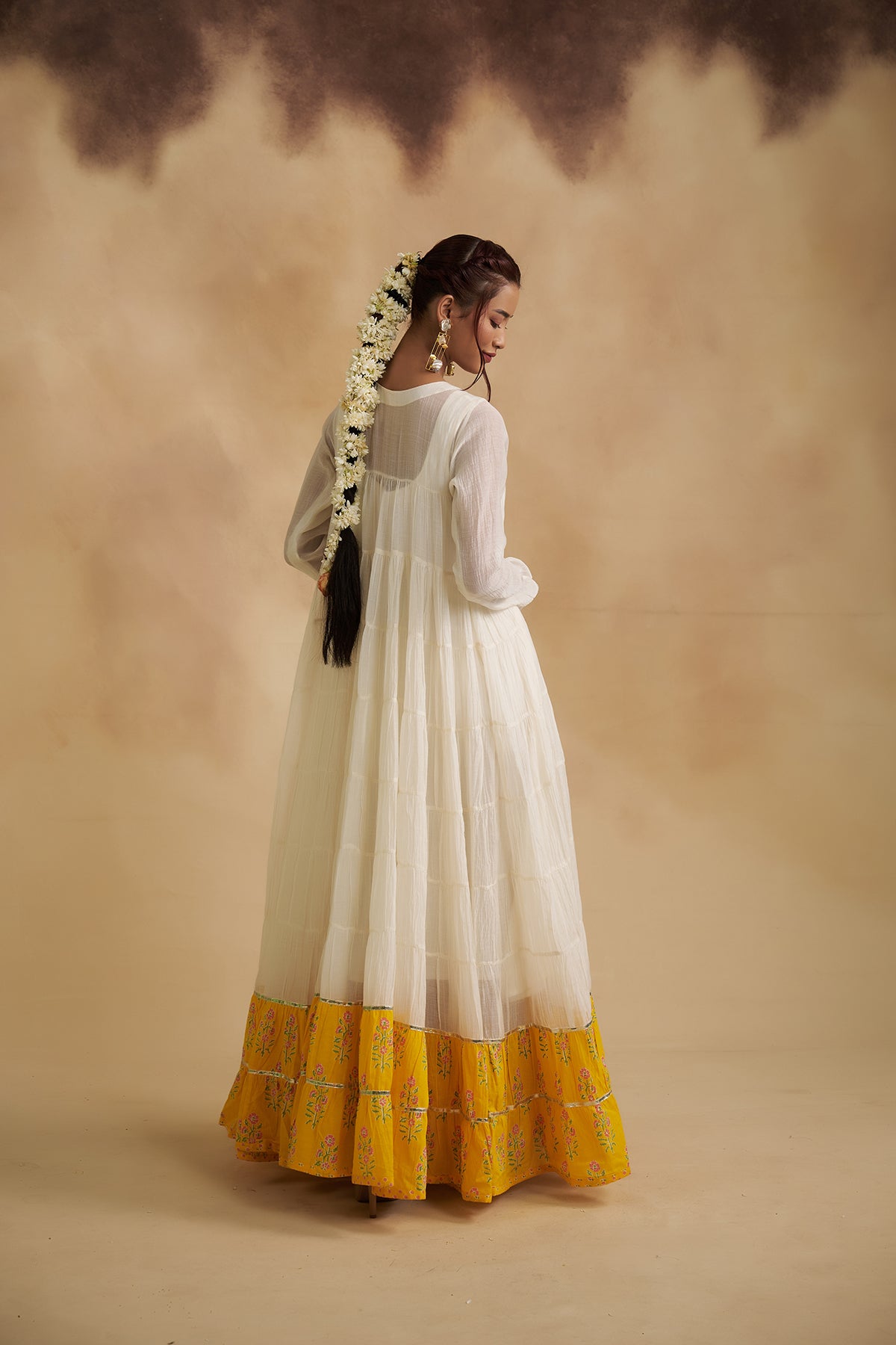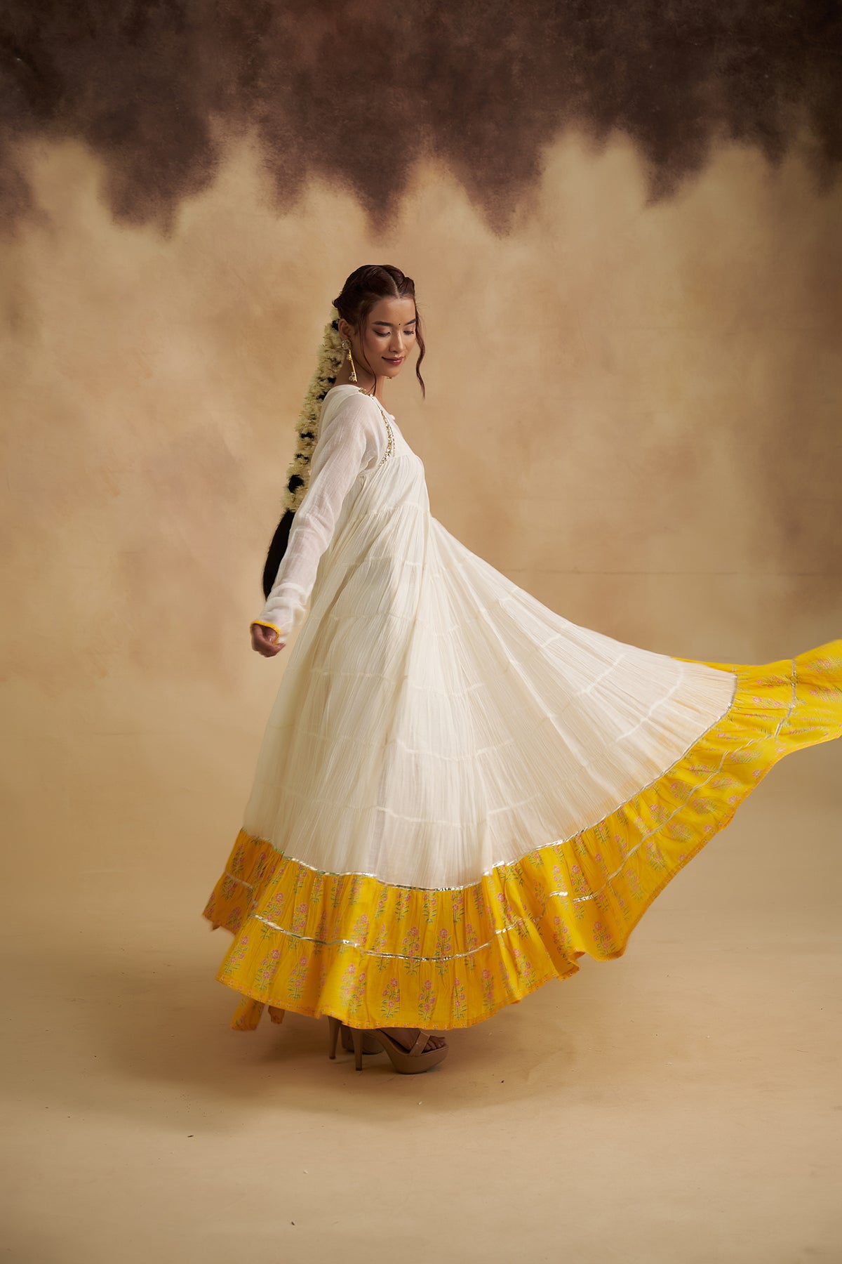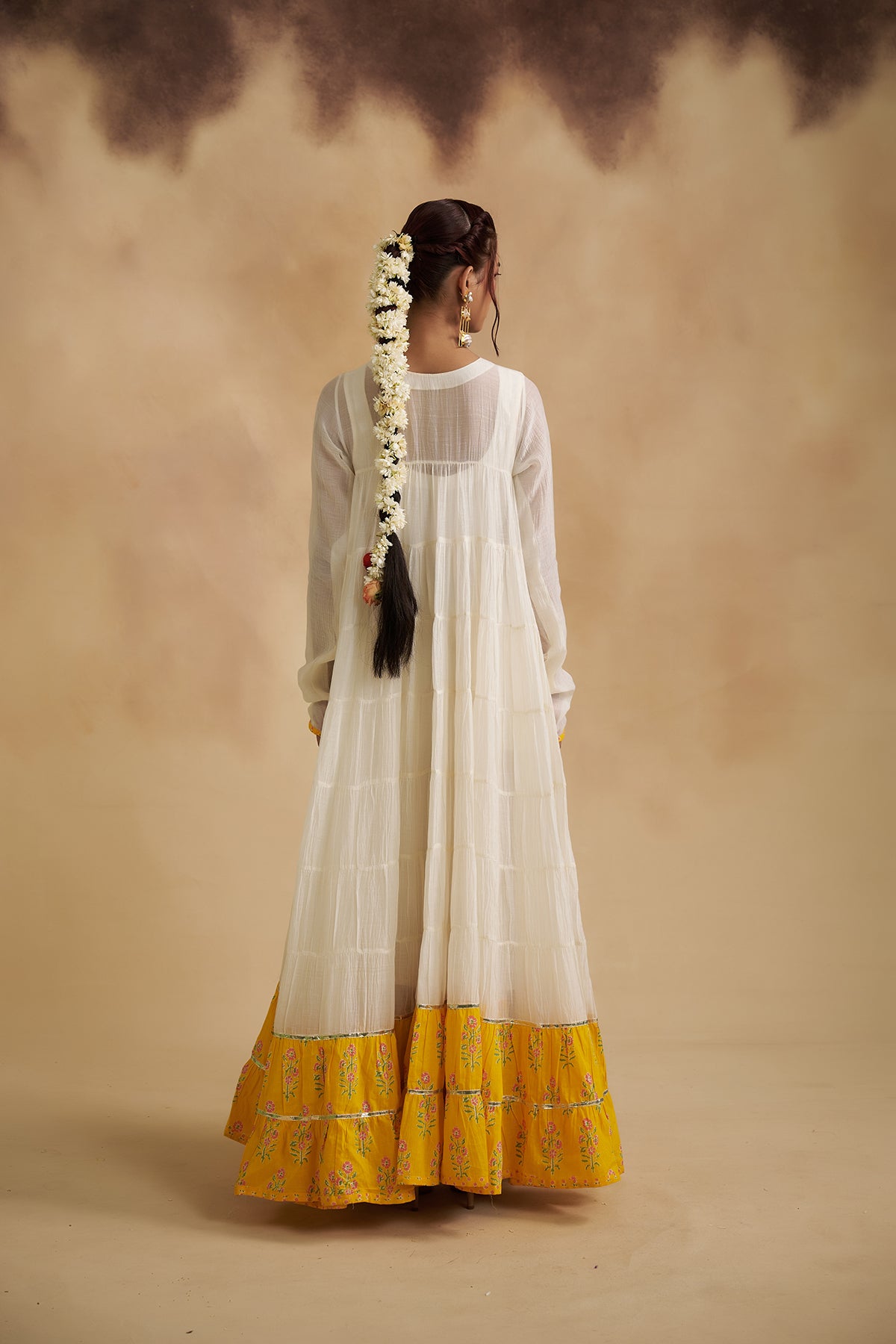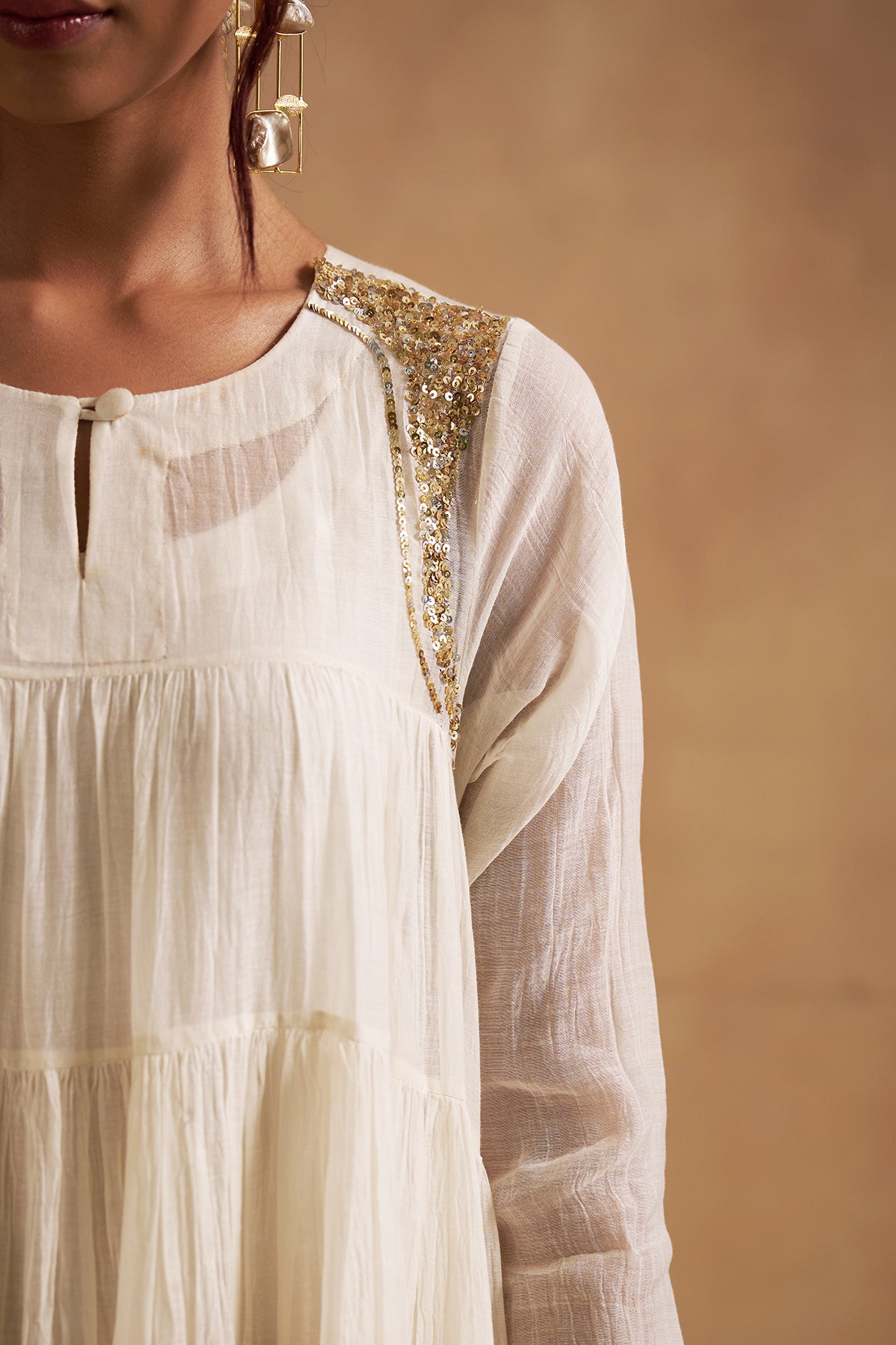 This piece is a multi tiered, pleated, ankle length dress with detailing of sequins along the neckline, hemline and has churidar sleeves. It's a good addition to your summer festive collection and can be worn on any special occasion. Note: All our dresses come with inner linings or slip.