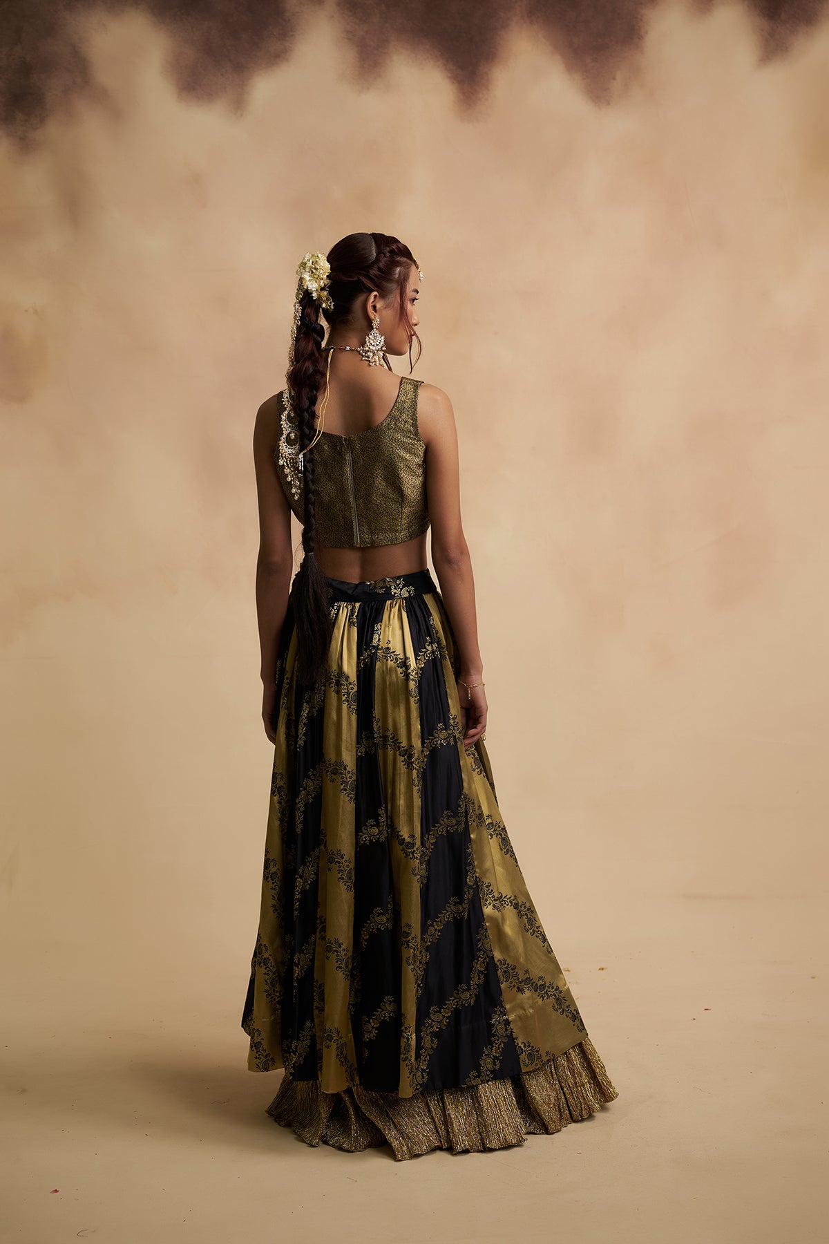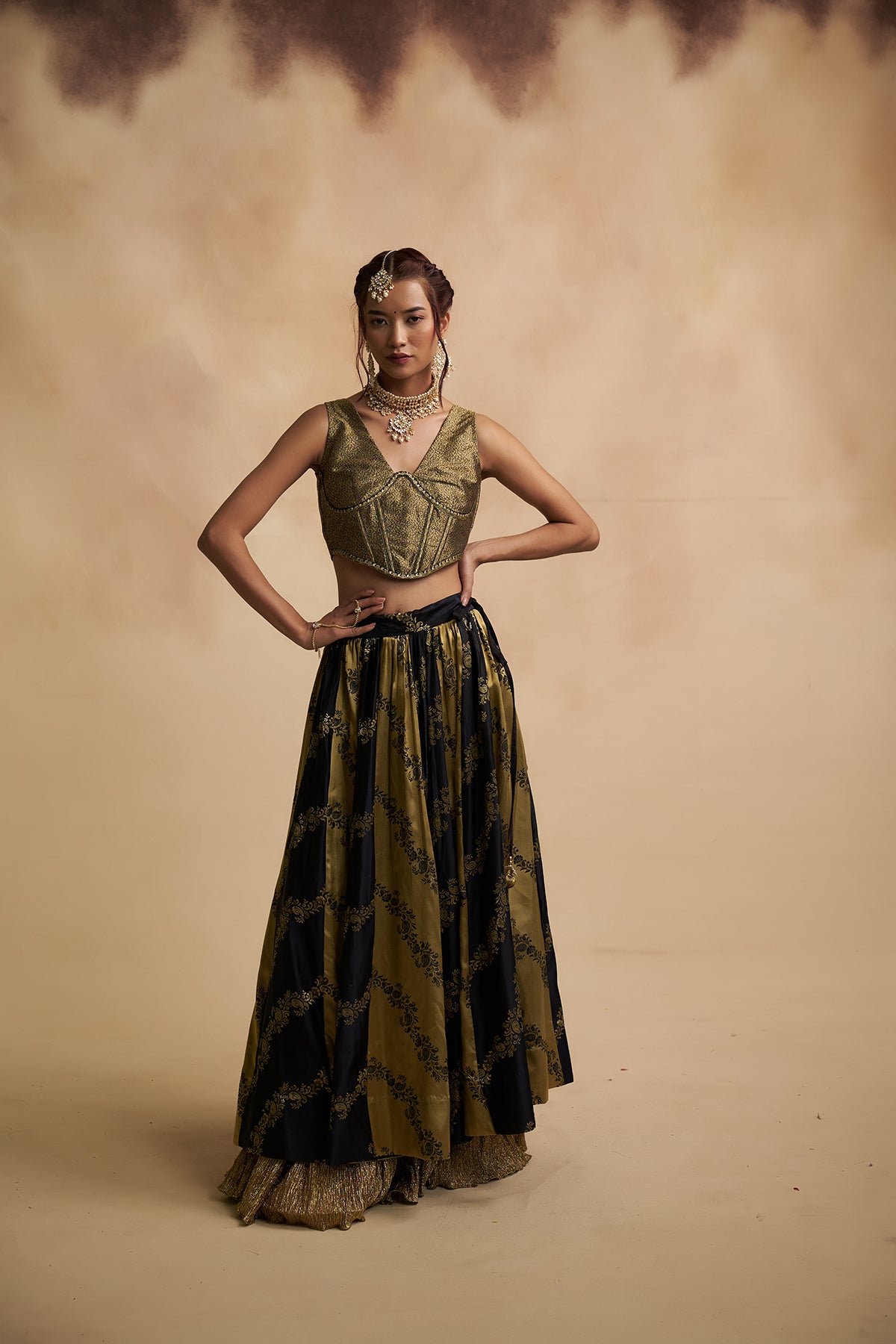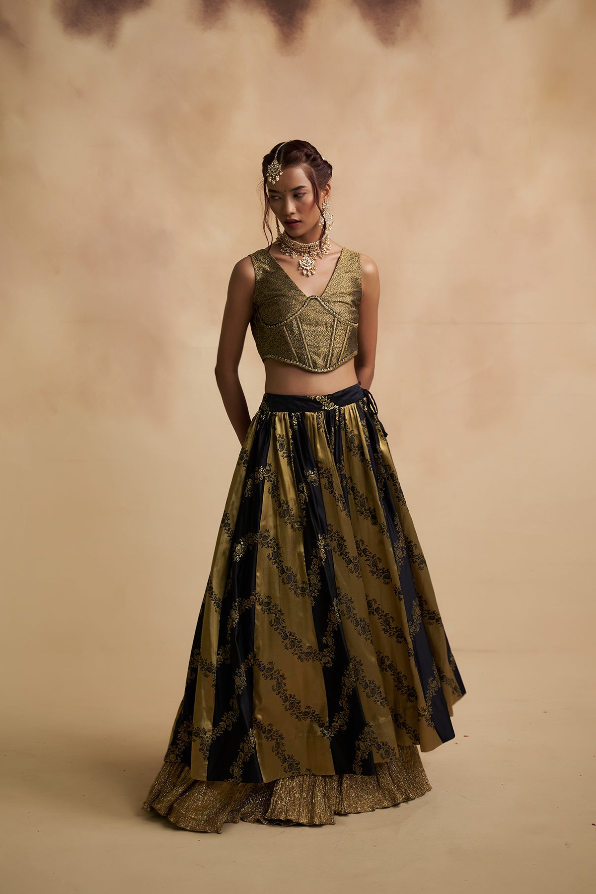 This Gajji silk lehenga comes with a contemporary take with a crushed tissue underlay detailing and a very trendy blouse with it. The lehenga comes with corset style short top, with fabric having weave pattern of ethnic motifs. Note: All our dresses come with inner linings or slip or underskirt as may be applicable.