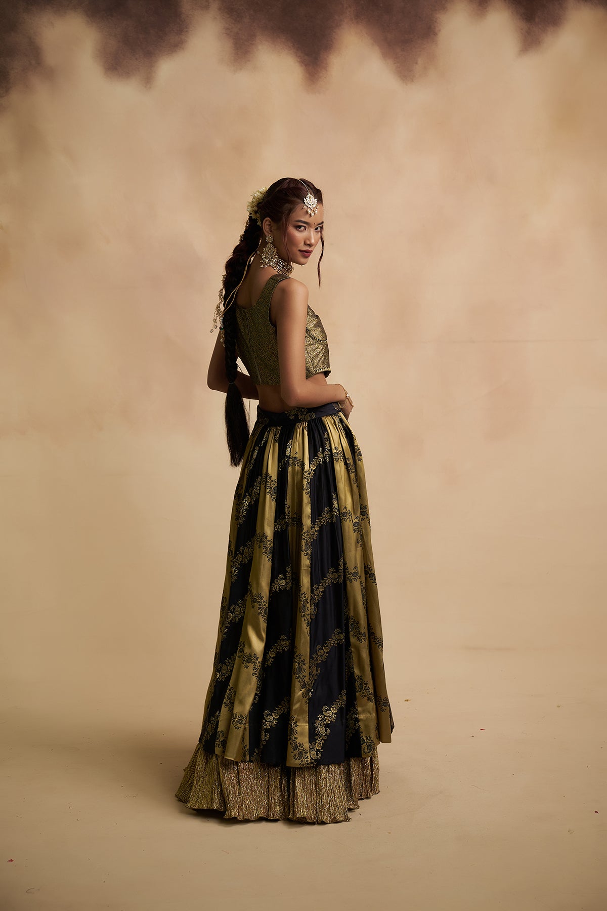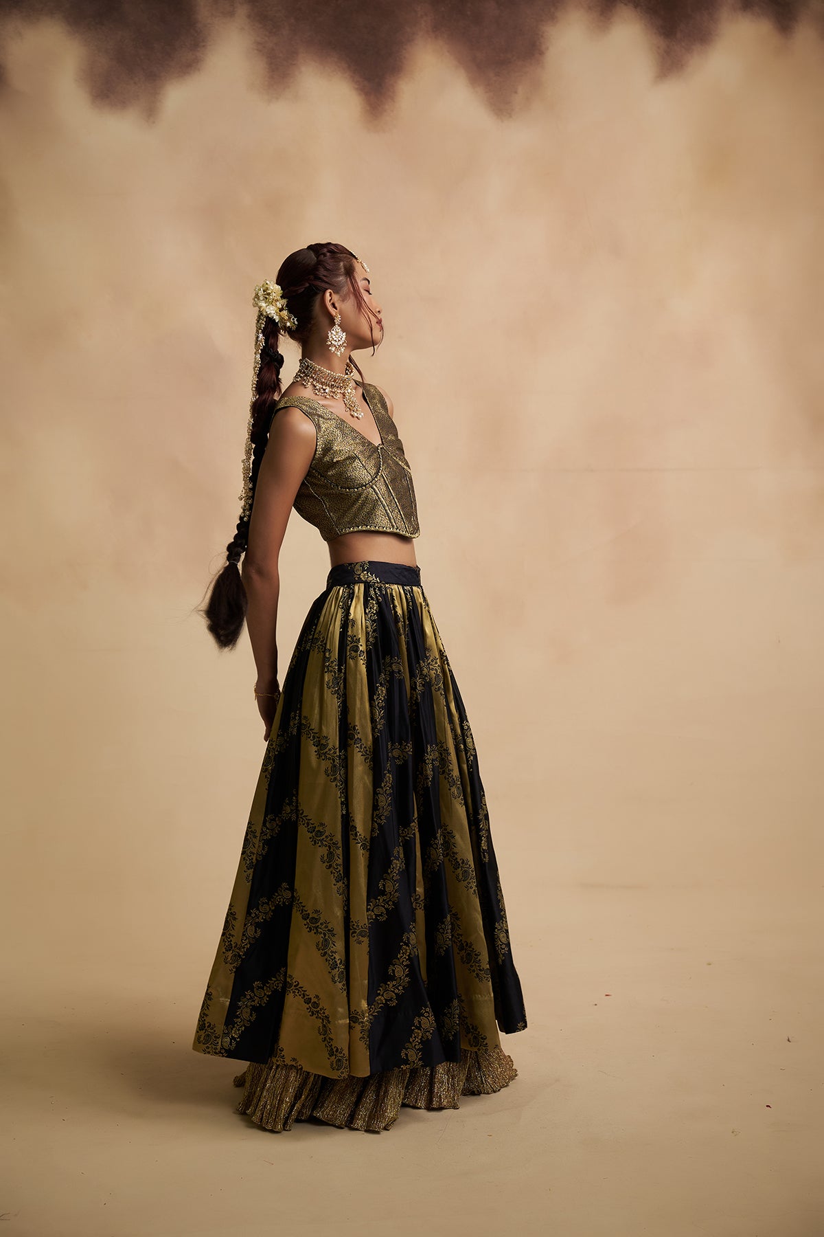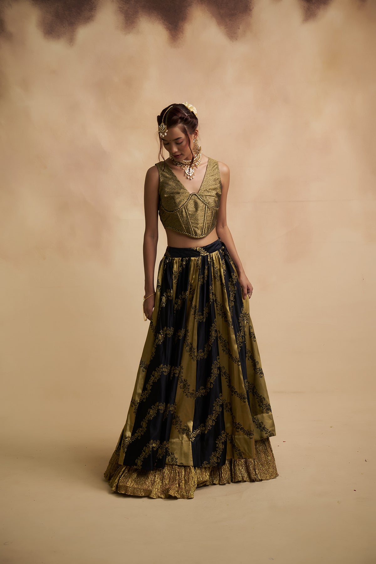 This Gajji silk lehenga comes with a contemporary take with a crushed tissue underlay detailing and a very trendy blouse with it. The lehenga comes with corset style short top, with fabric having weave pattern of ethnic motifs. Note: All our dresses come with inner linings or slip or underskirt as may be applicable.