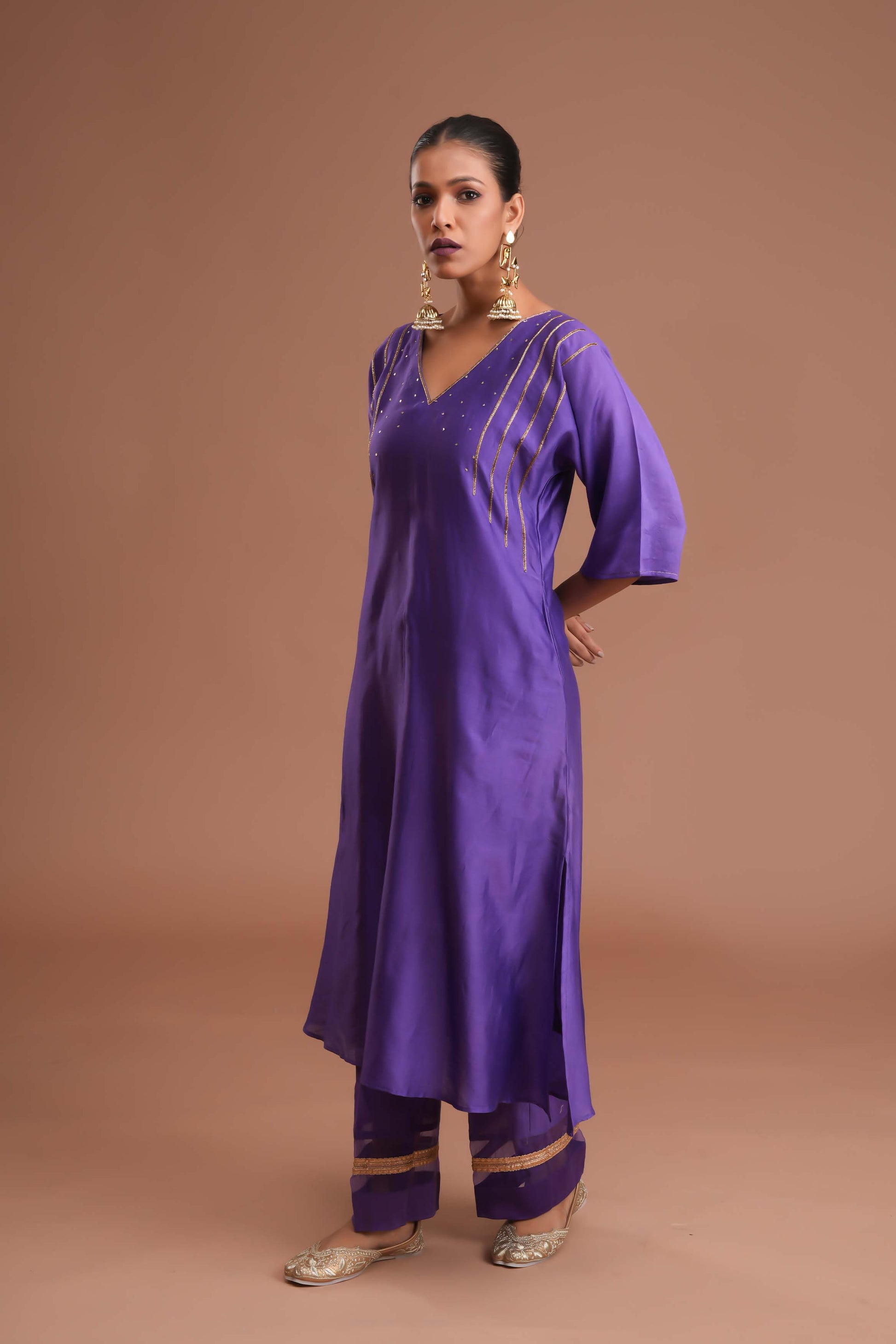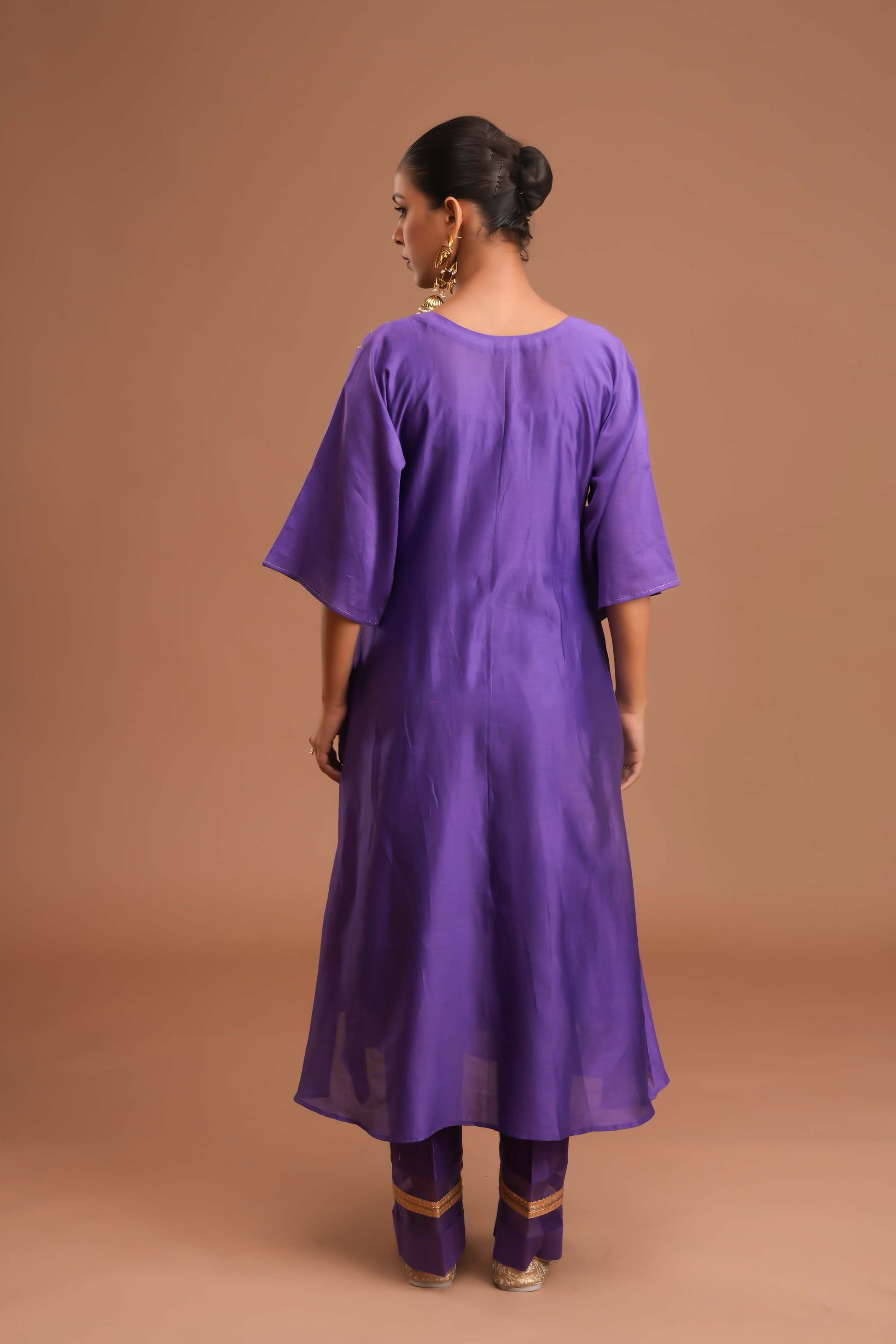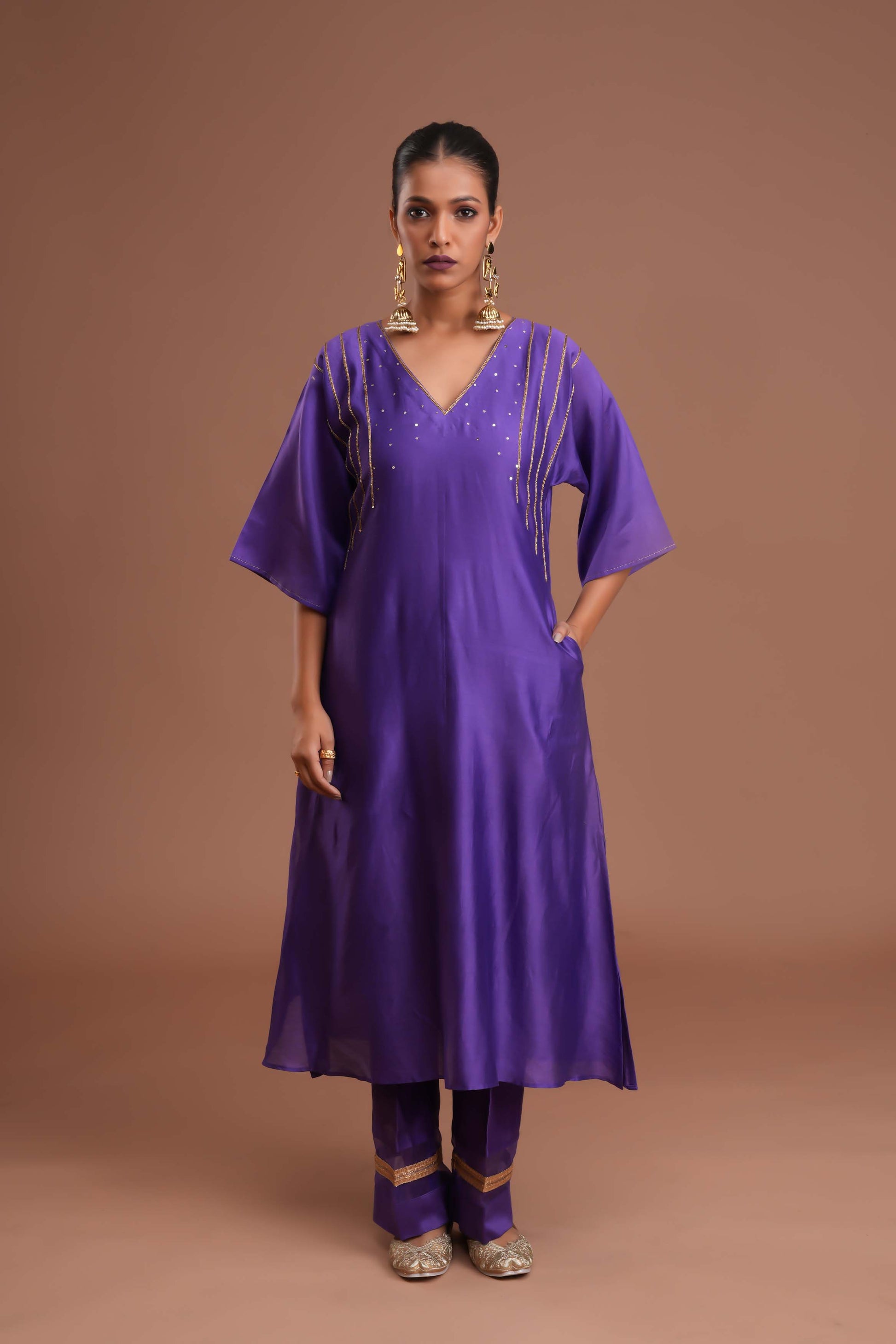 Introducing the Kajra Kaftan Set, a tribute to the depth and mystery of a woman, inspired by the enchanting beauty of kajal . This attire in rich dark purple colour , designed for both comfort and elegance, complete with practical pockets for ease of movement. Paired with stylish pants highlighted by intricate Rajasthani gota work, the Kajra Kaftan Set seamlessly blends traditional artistry with contemporary style. Perfect for any occasion, this outfit allows you to express your unique charm while feeling effortlessly chic. Embrace the allure of mystery and sophistication with the Kajra Kaftan Set, a perfect addition to your wardrobe that reflects your inner depth and grace.