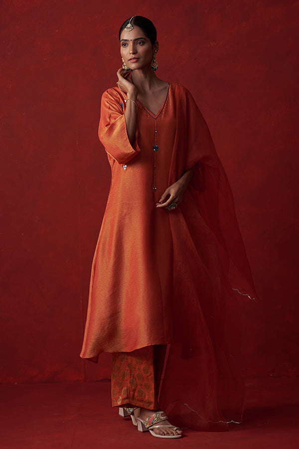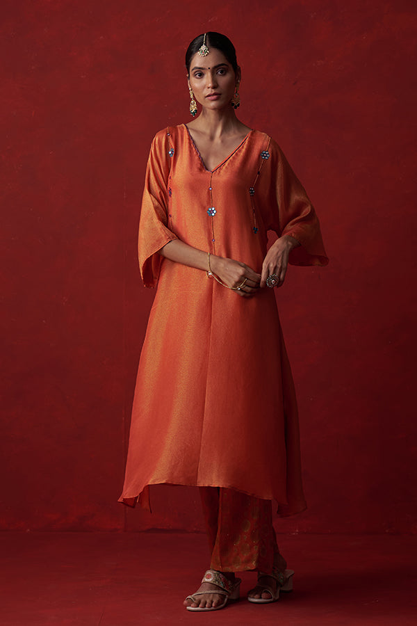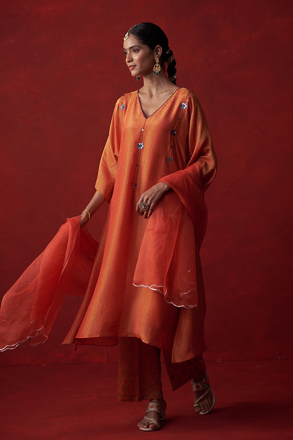 This kaftan style suit has beautiful embroidery on the front panel with Zari, Pearls & Sequins, The dupatta is made of Georgette fabric having cheeta of Sequins and scalloping detailing Note: All our dresses come with inner linings or slip.