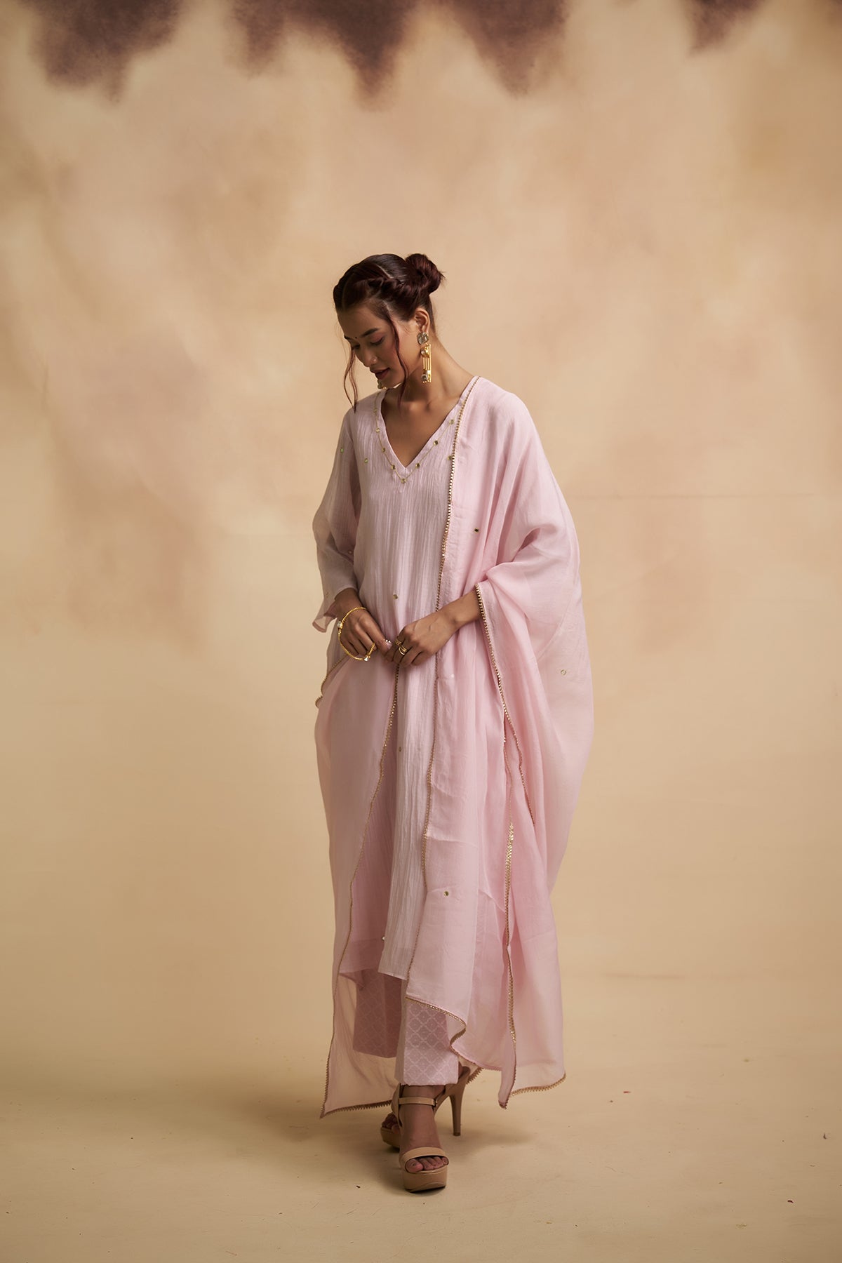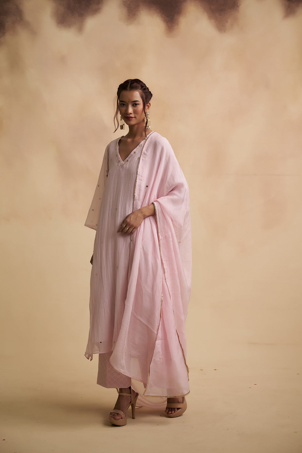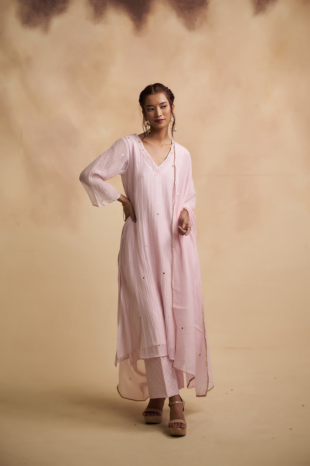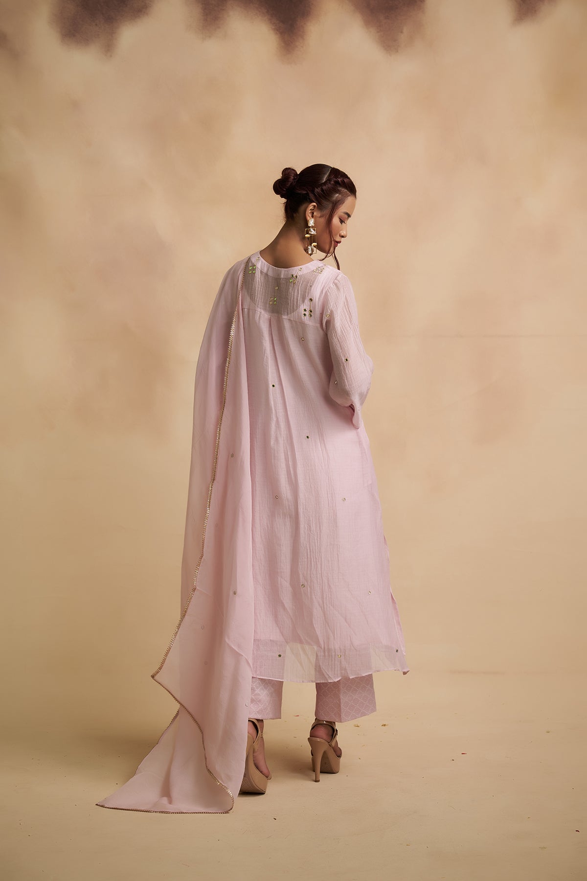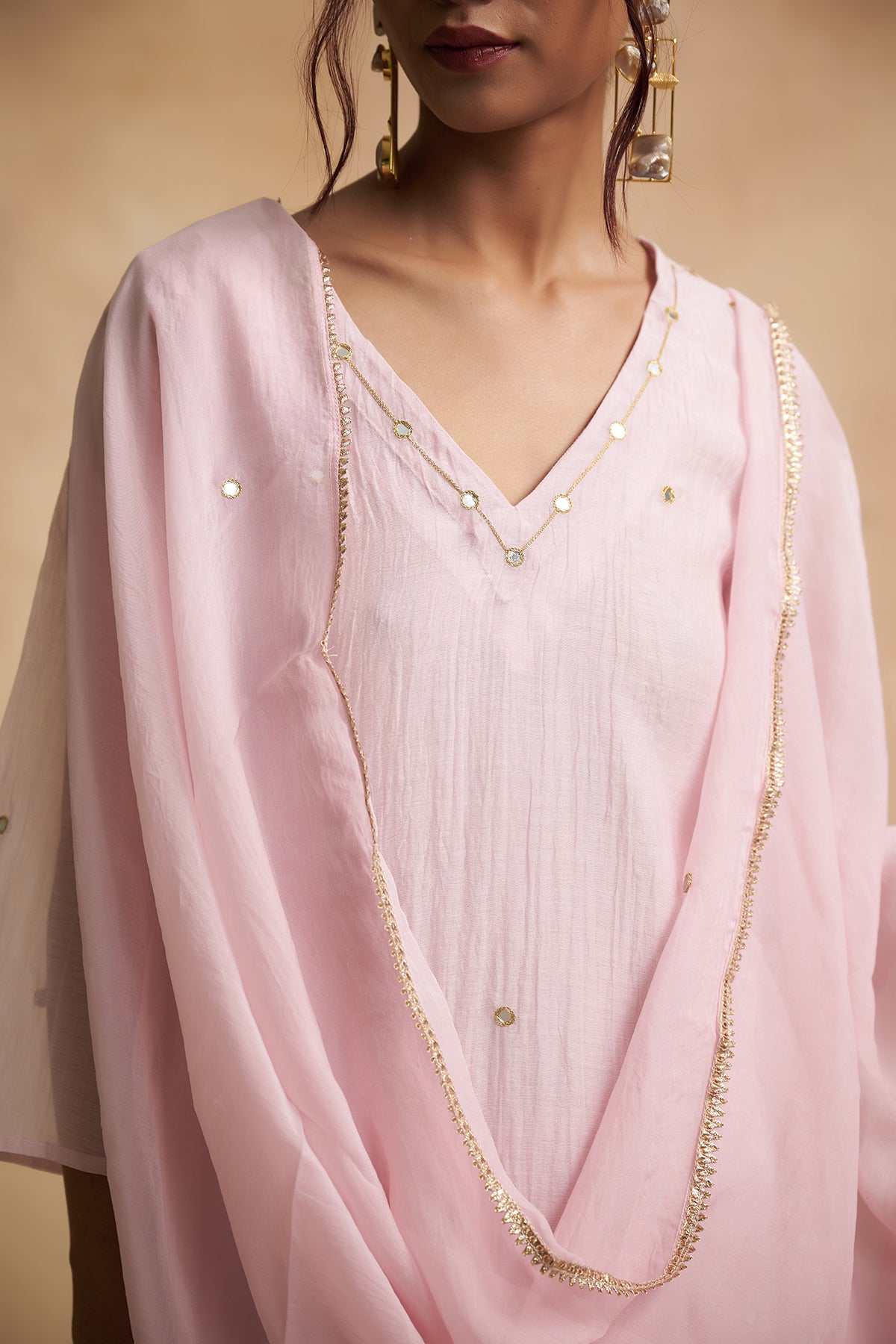The suit has mirror & zari work detailing on back/front panels and also on the sleeves and along the neckline. This suit comes with the a chanderi dupatta with lace & mirror work detailing, it's a good addition to your summer staples. Note: All are dresses comes with inner linings or slip.