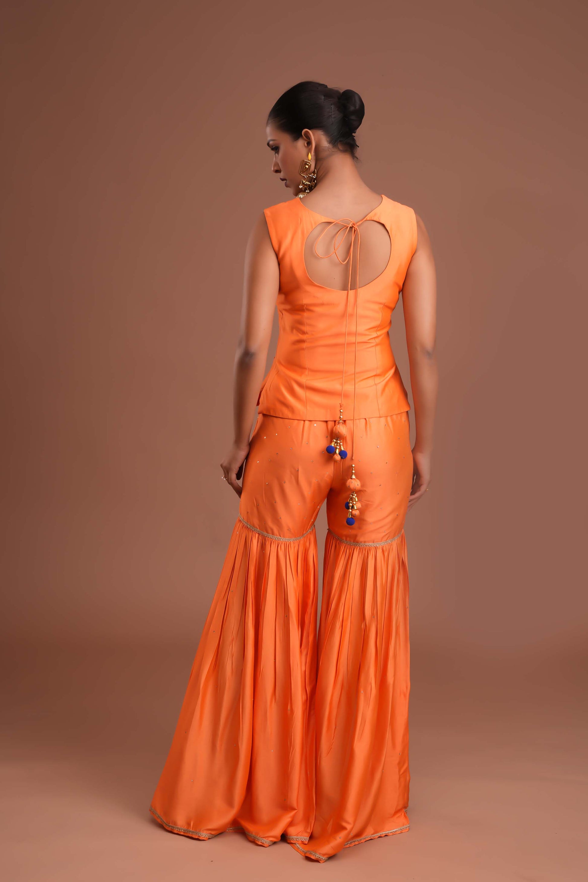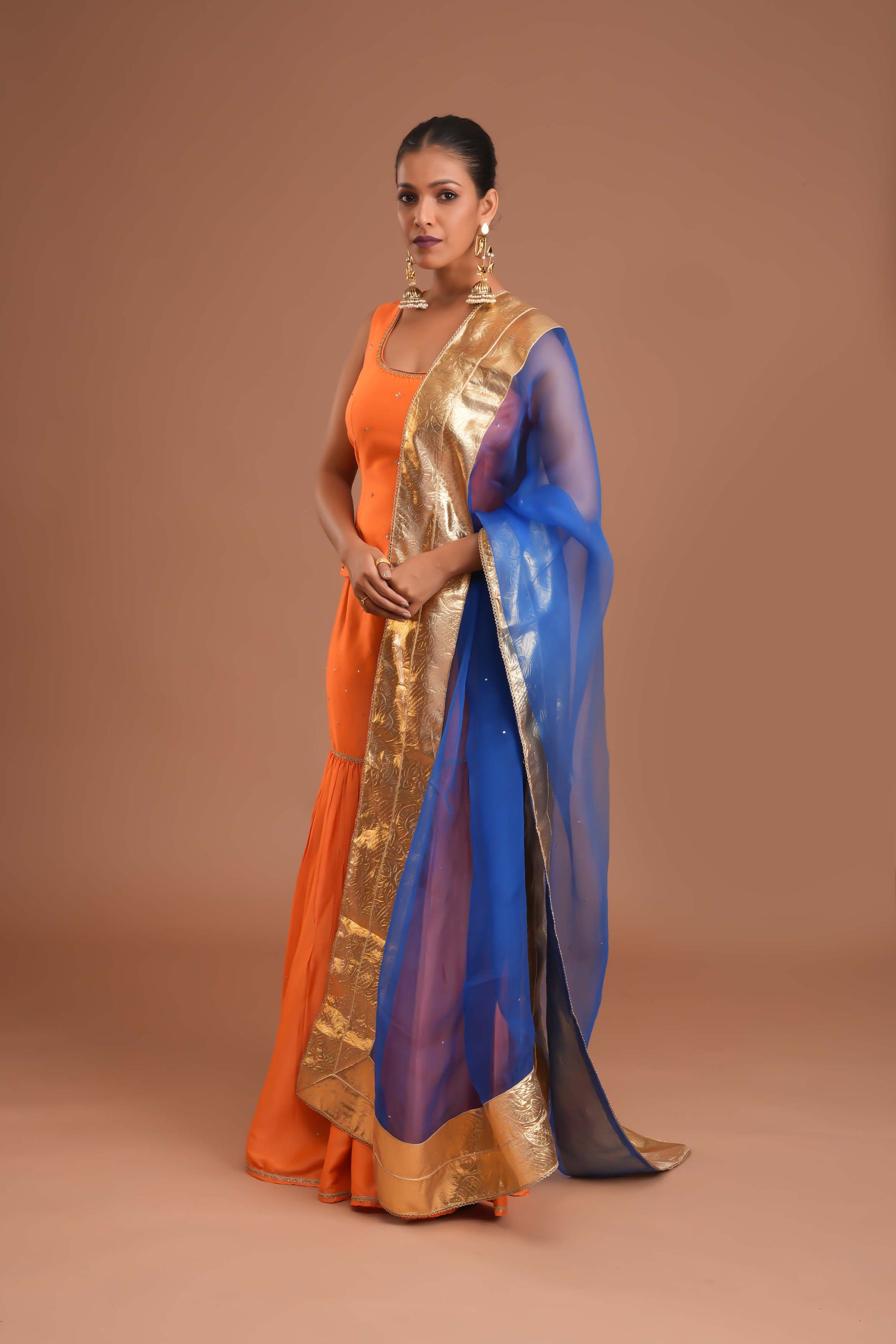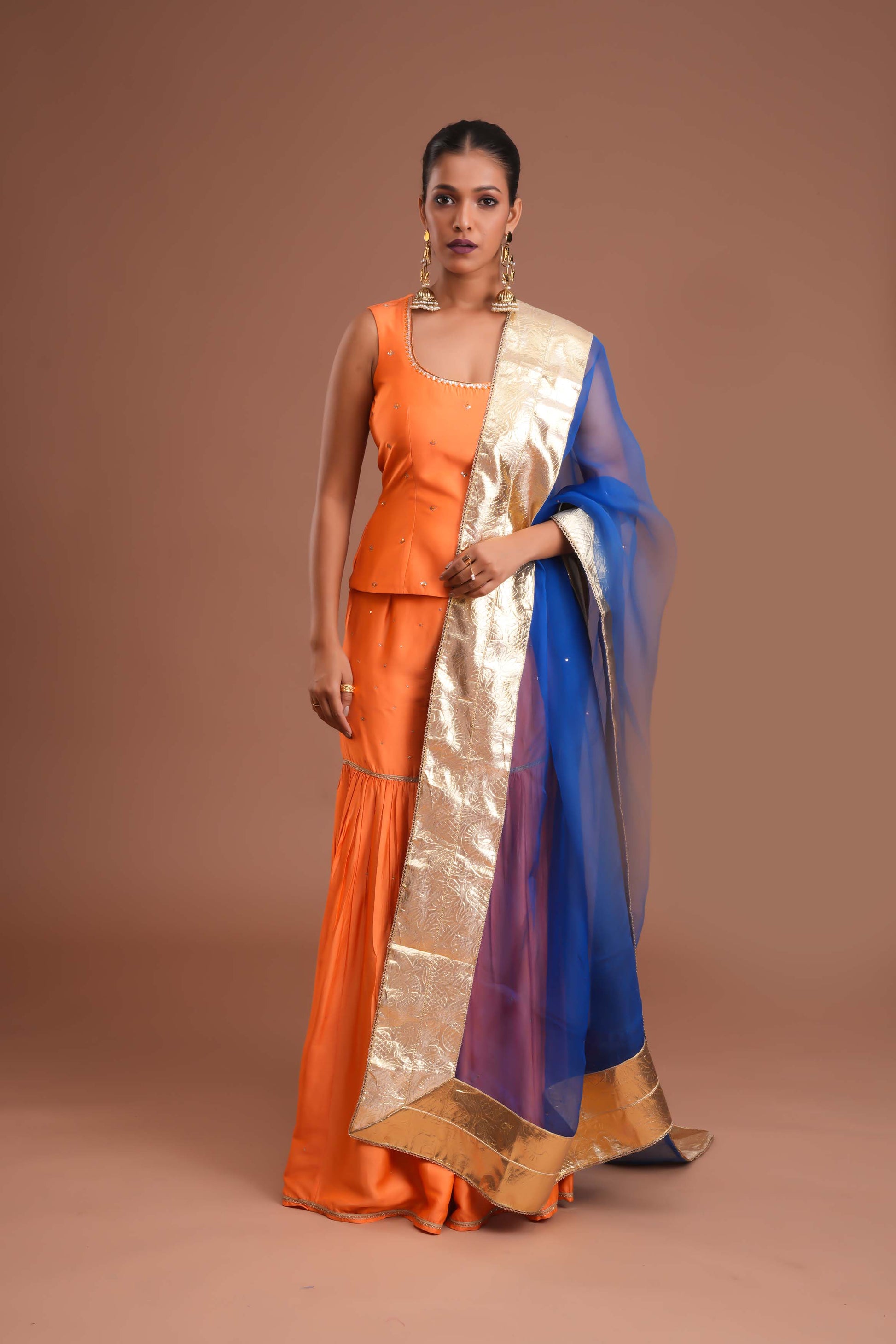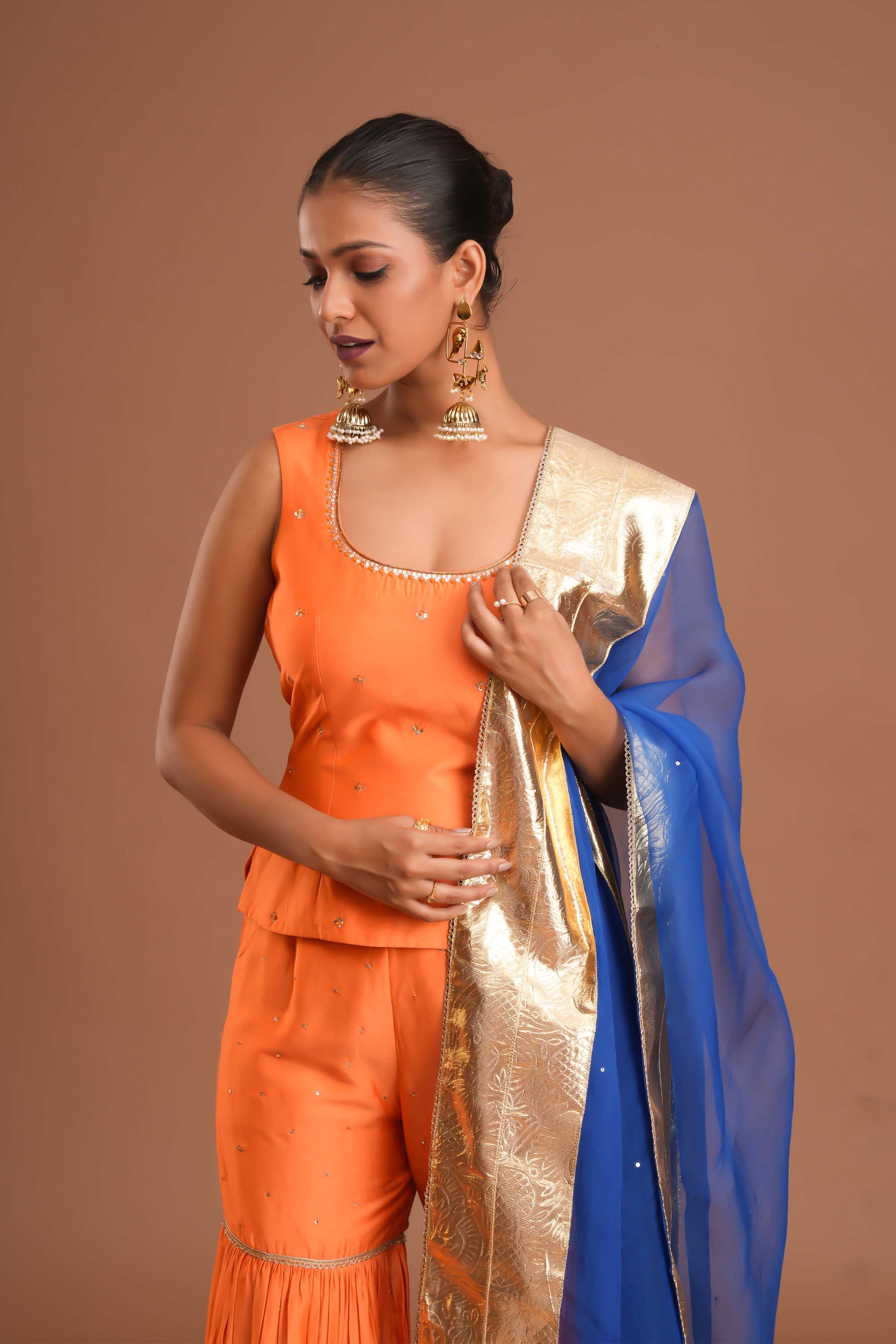Introducing the Mohini Garara Set, a celebration of the captivating allure of a woman. This stunning ensemble features a vibrant orange colour crafted from luxurious pure silk, designed to highlight your natural beauty and grace. The set is complemented by an exquisite blue sheer dupatta, elegantly adorned with a wide golden border that adds a touch of opulence. The flowing sharara design offers both comfort and style, making it perfect for festive occasions or special gatherings. Embrace your inner charm with the Mohini Sharara Set, a beautiful expression of femininity and attraction that ensures you stand out in any crowd.