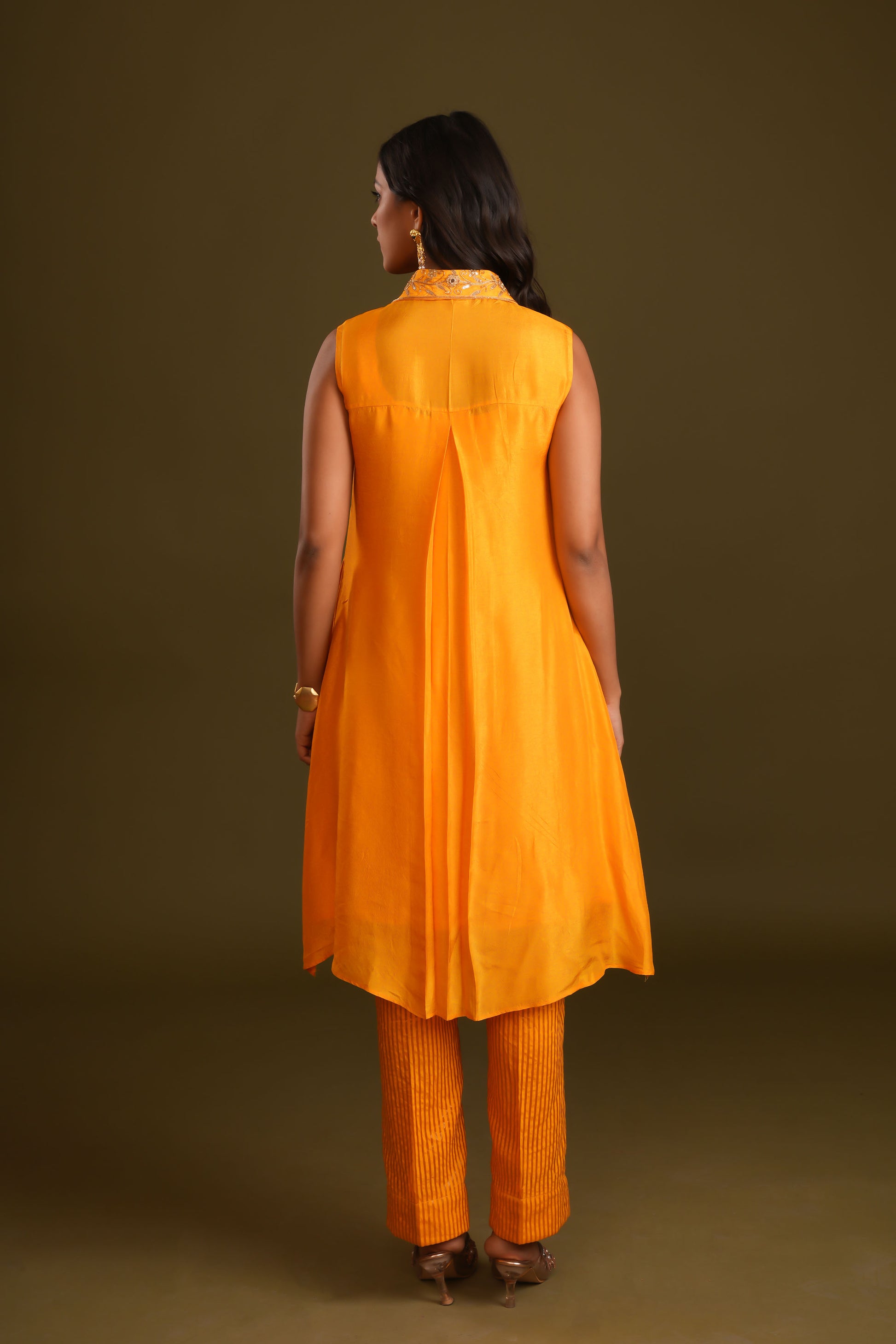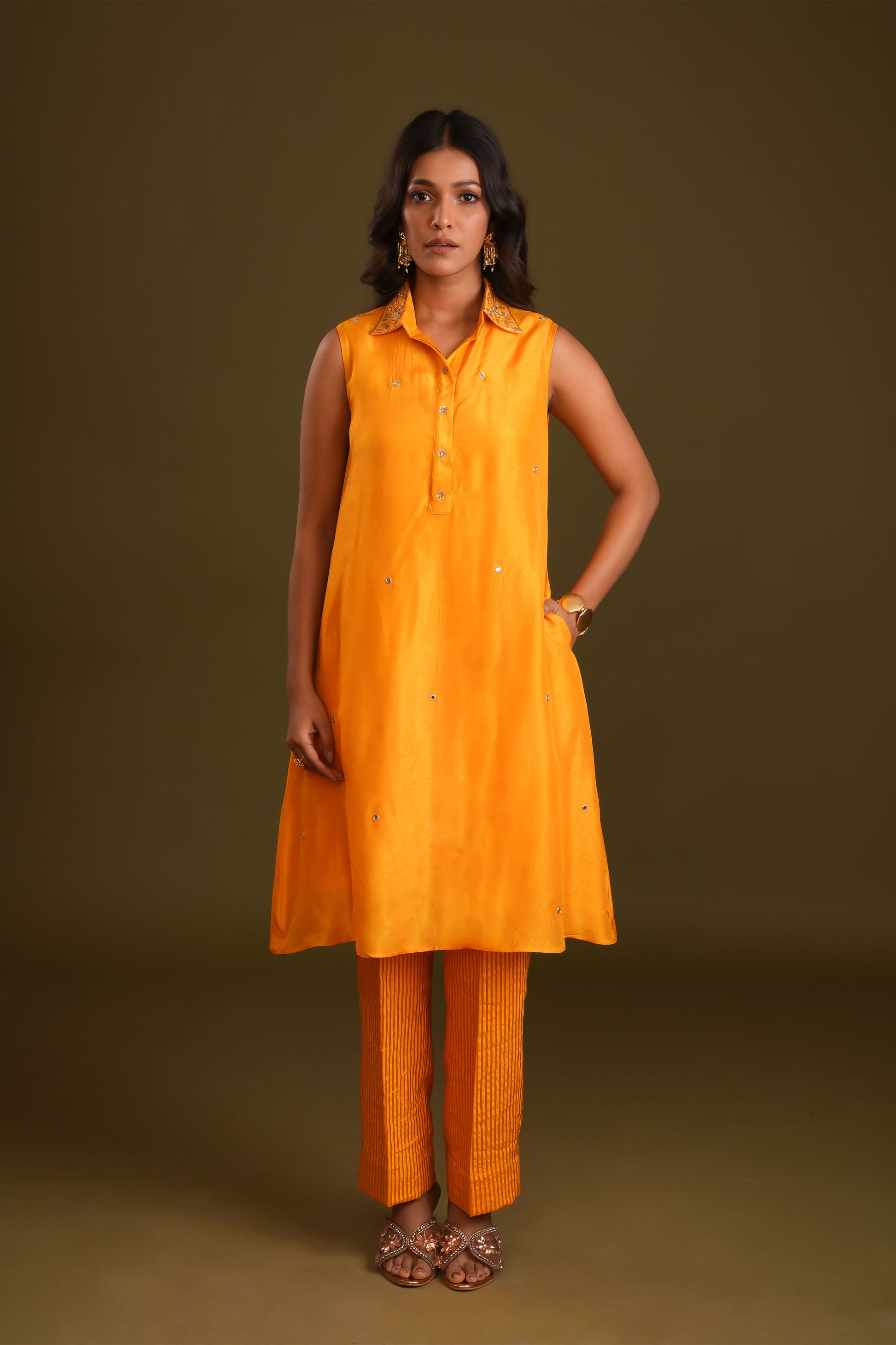 Crafted from rich silk, this A-line tunic features intricate hand embroidery with a minimal design, adding a touch of sophistication. The classic shirt collar and elegant silhouette make it a versatile choice for any occasion, from festive gatherings to formal events. Paired with matching pants, this ensemble combines timeless style and comfort, perfect for making a refined statement.