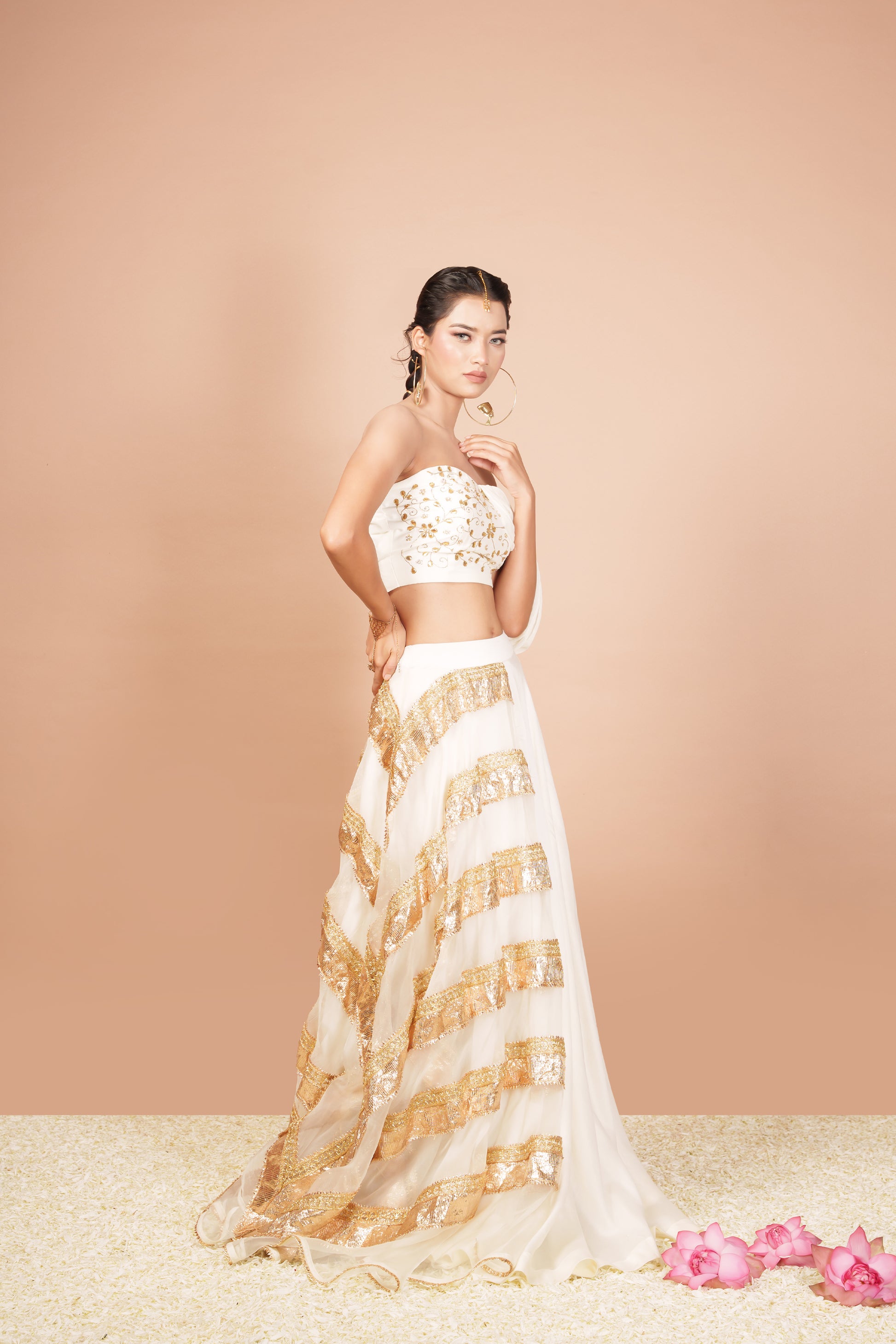 This Nayaab double layer lehenga is dedicated to a Precious lady as it's name . This outfit is a perfect blend of tradition and contemporary style in luxurious pure silk, this lehenga is adorned with an exquisite blouse with intricate hand embroidery that creates a striking contrast against the soft white fabric. The chic pleated drop-off shoulder design with one-sided sleeve adds a unique flair, making it perfect for any special occasion. Ideal for weddings, parties, or any festive celebration, this piece is sure to turn heads and make unforgettable memories.