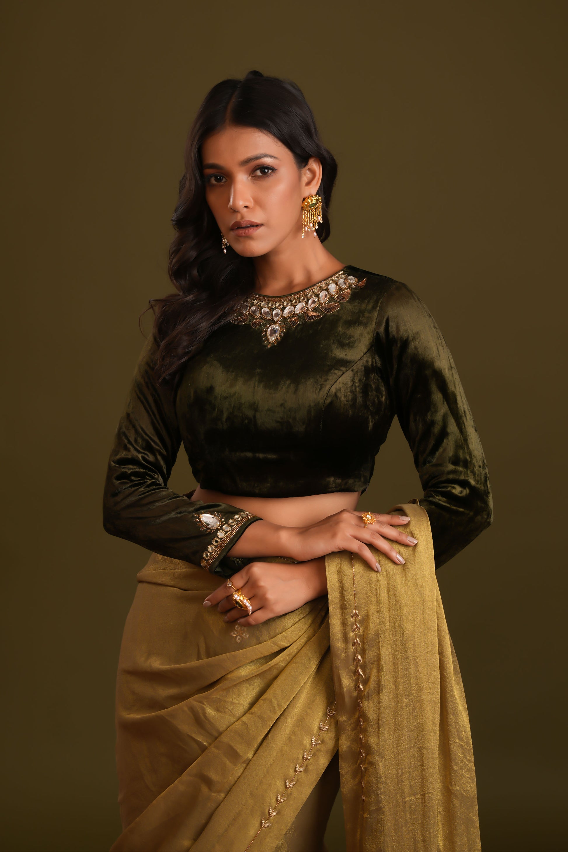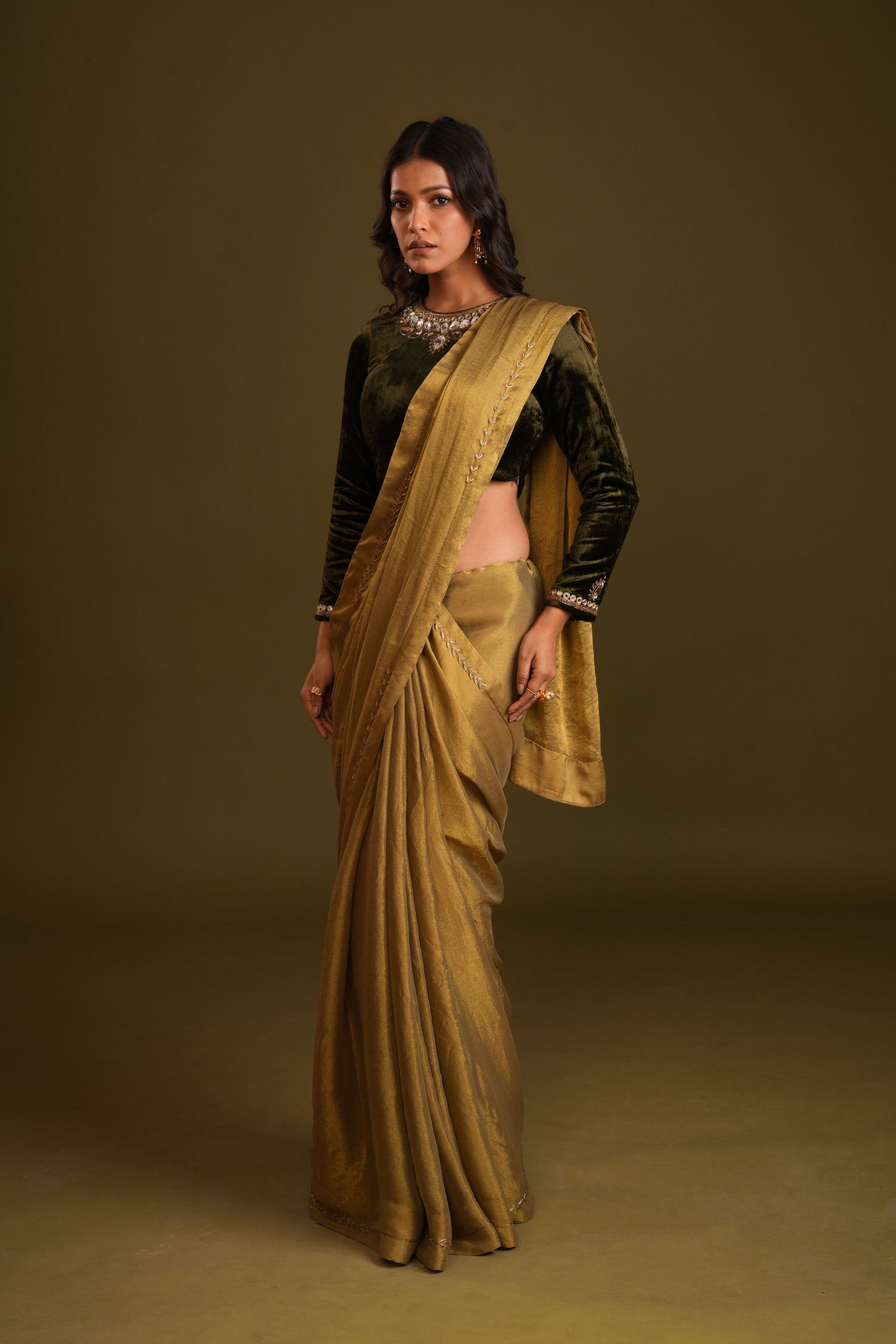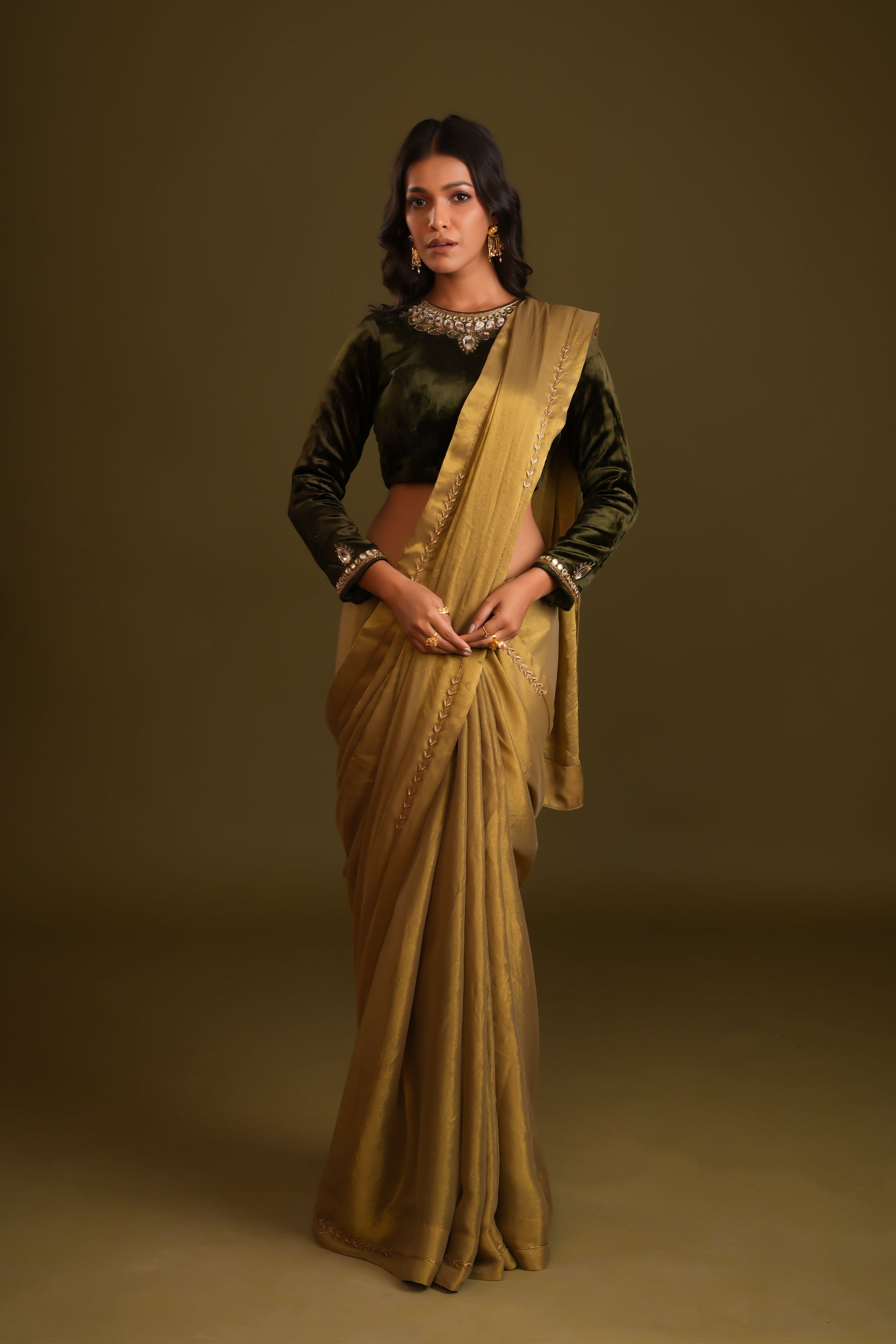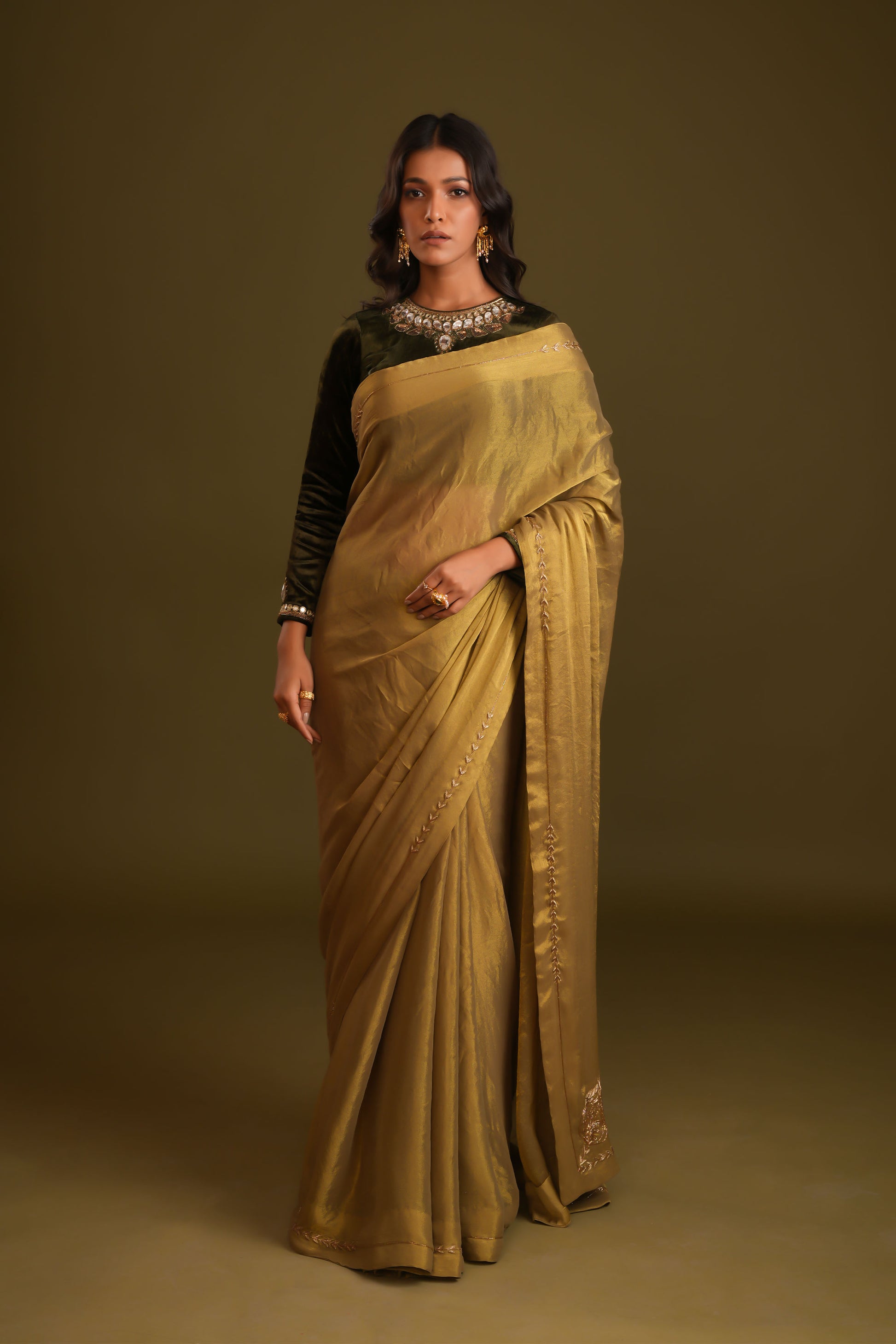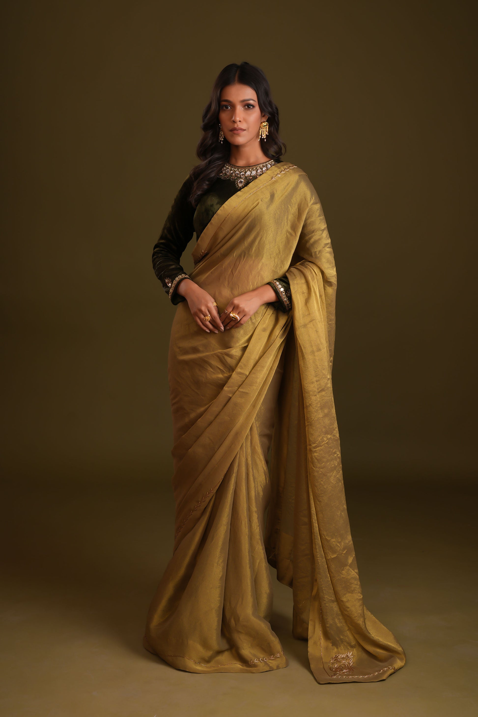 This elegant olive green saree, made from shimmer tissue fabric, features minimal handwork on the borders and pallu for a refined look. Paired with a dark olive green blouse, it boasts intricate embroidery on the neckline, creating a stunning, necklace-like effect. A perfect blend of simplicity and sophistication for any special occasion.