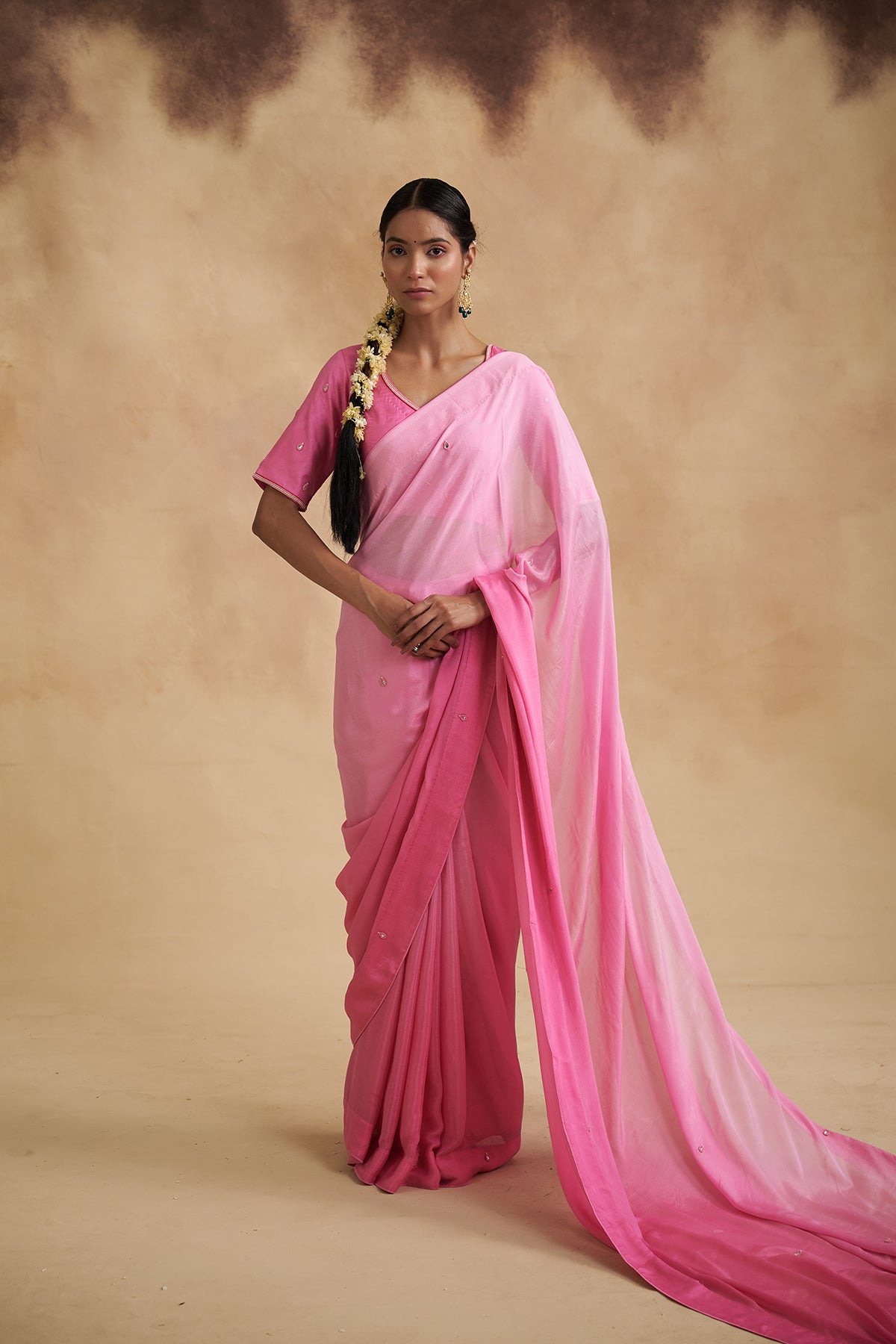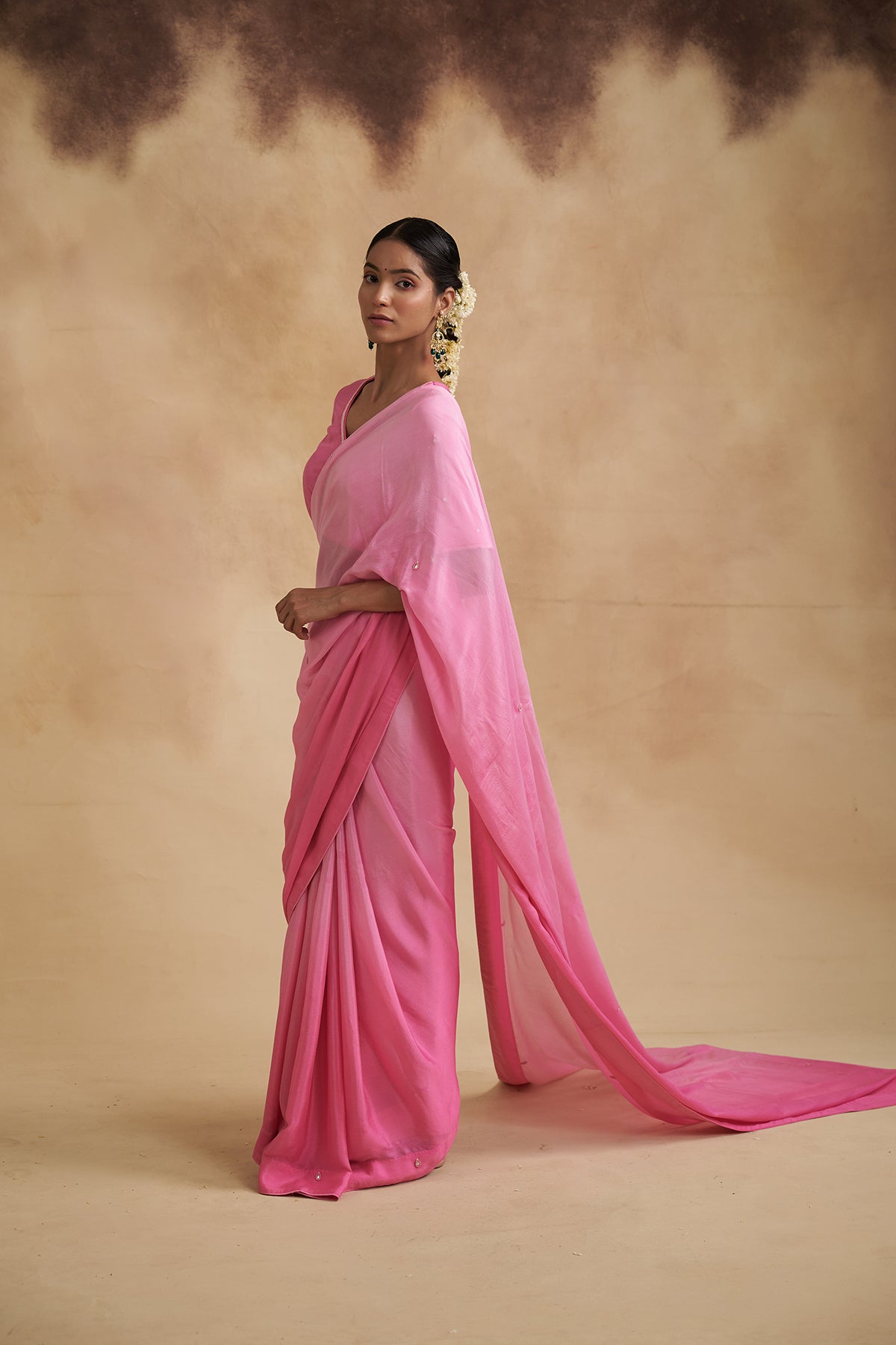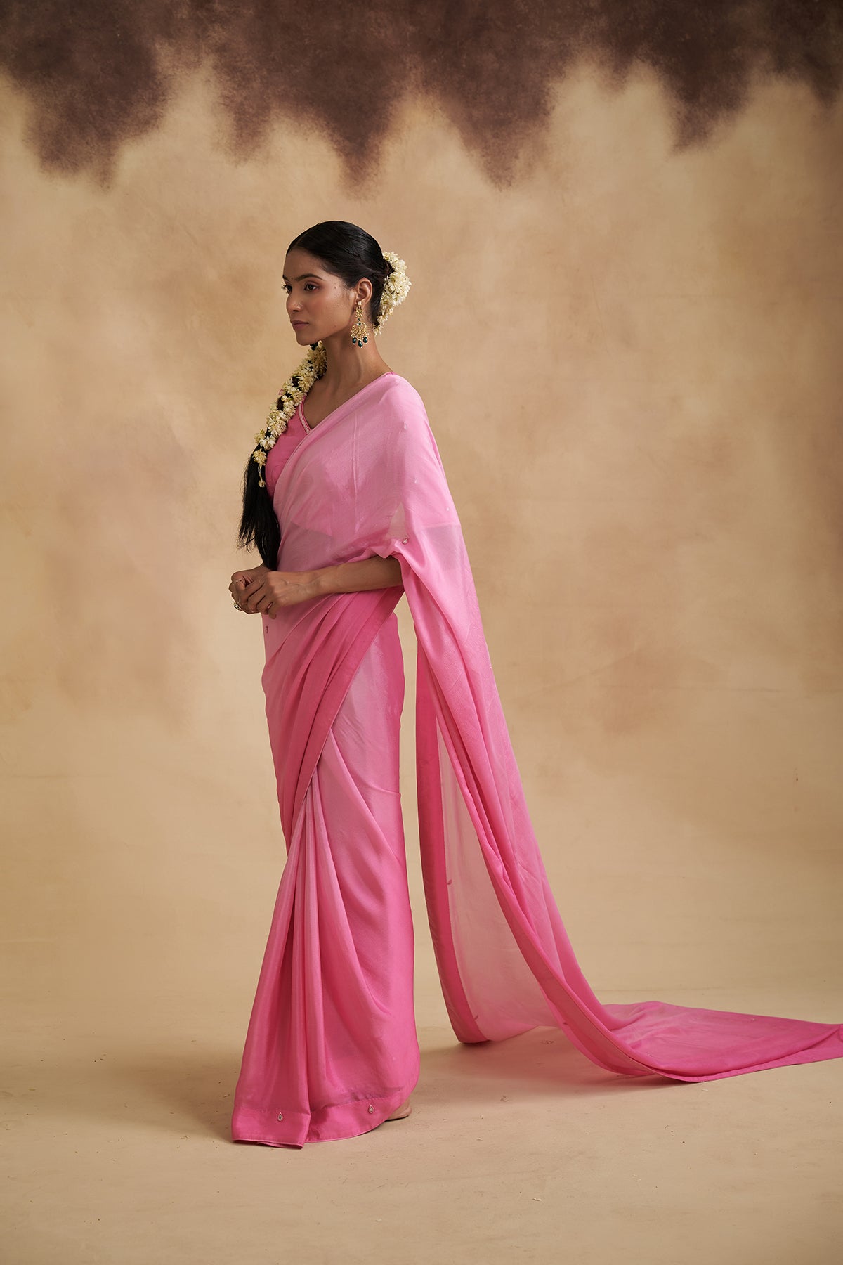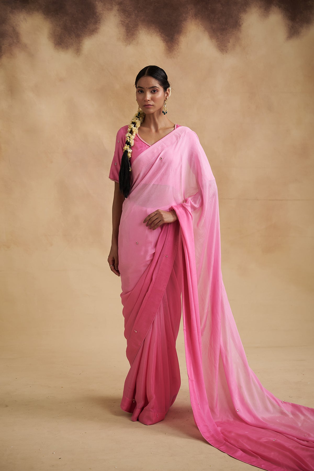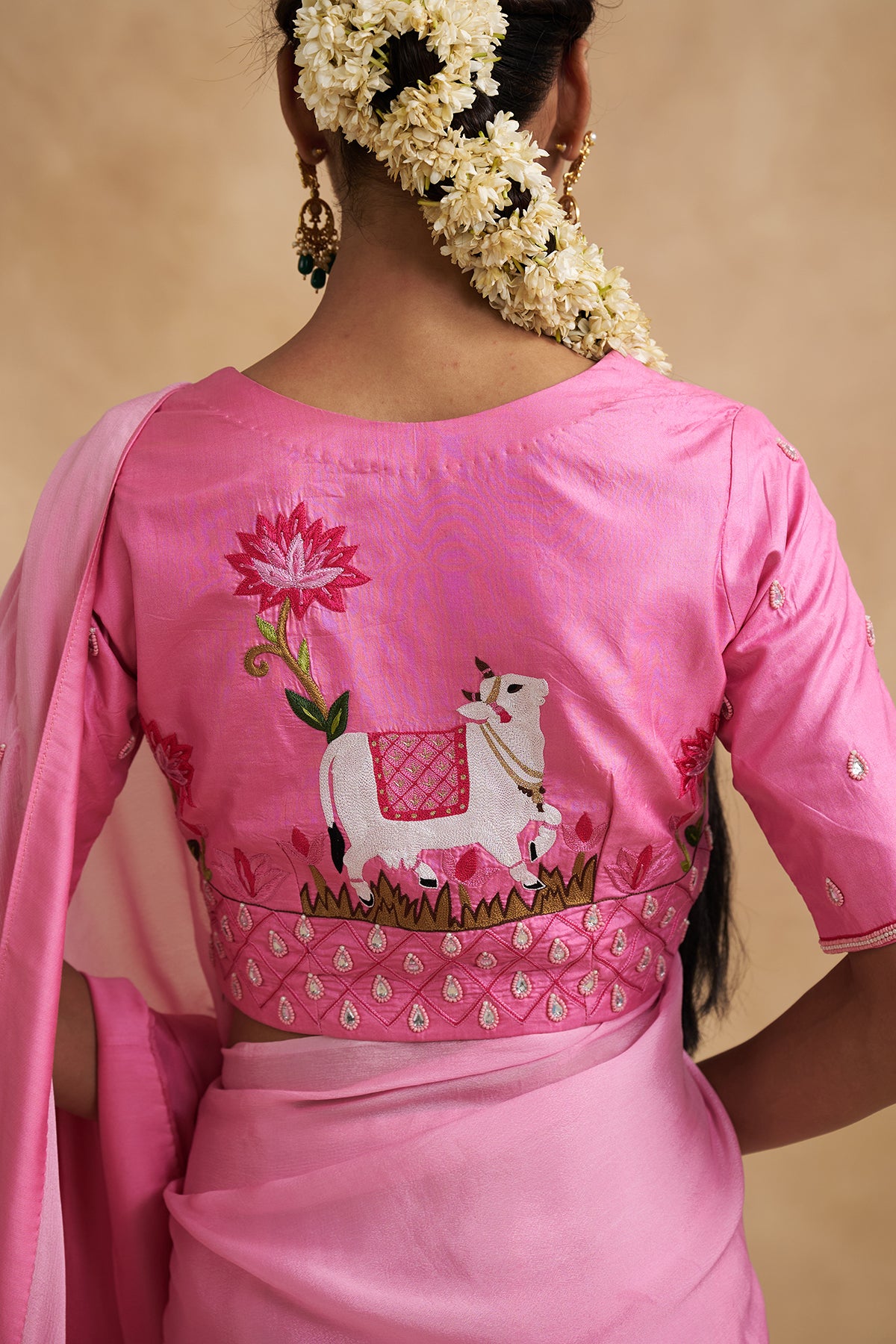 This graceful saree in shades of pink is made from Chinon Chiffon fabric and has cheeta of Pearl and Zircon stones all through the length. The saree is matched with even more intricately designed blouse in Pichwai art style using Resham, Zari and Pearls which further adds to the grace of this piece. A perfect blend of simplicity and sophistication for any special occasion.