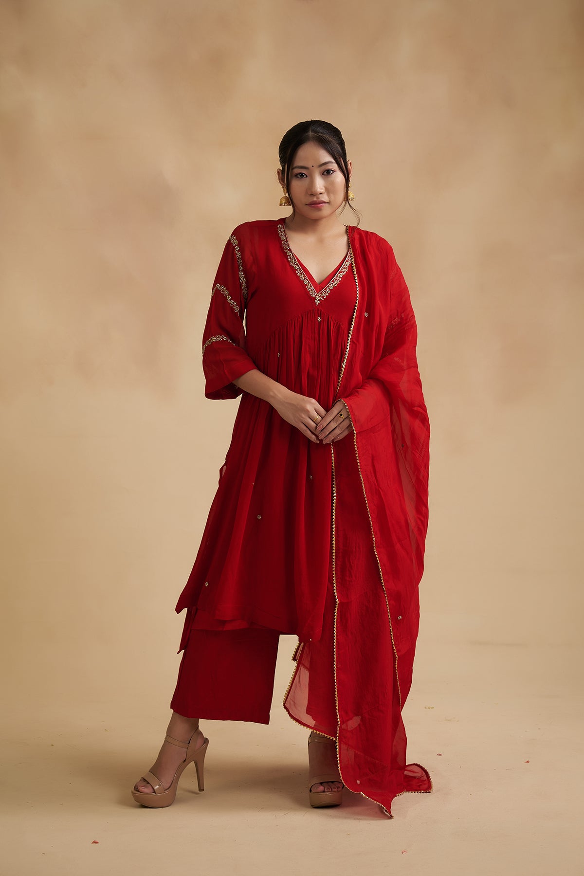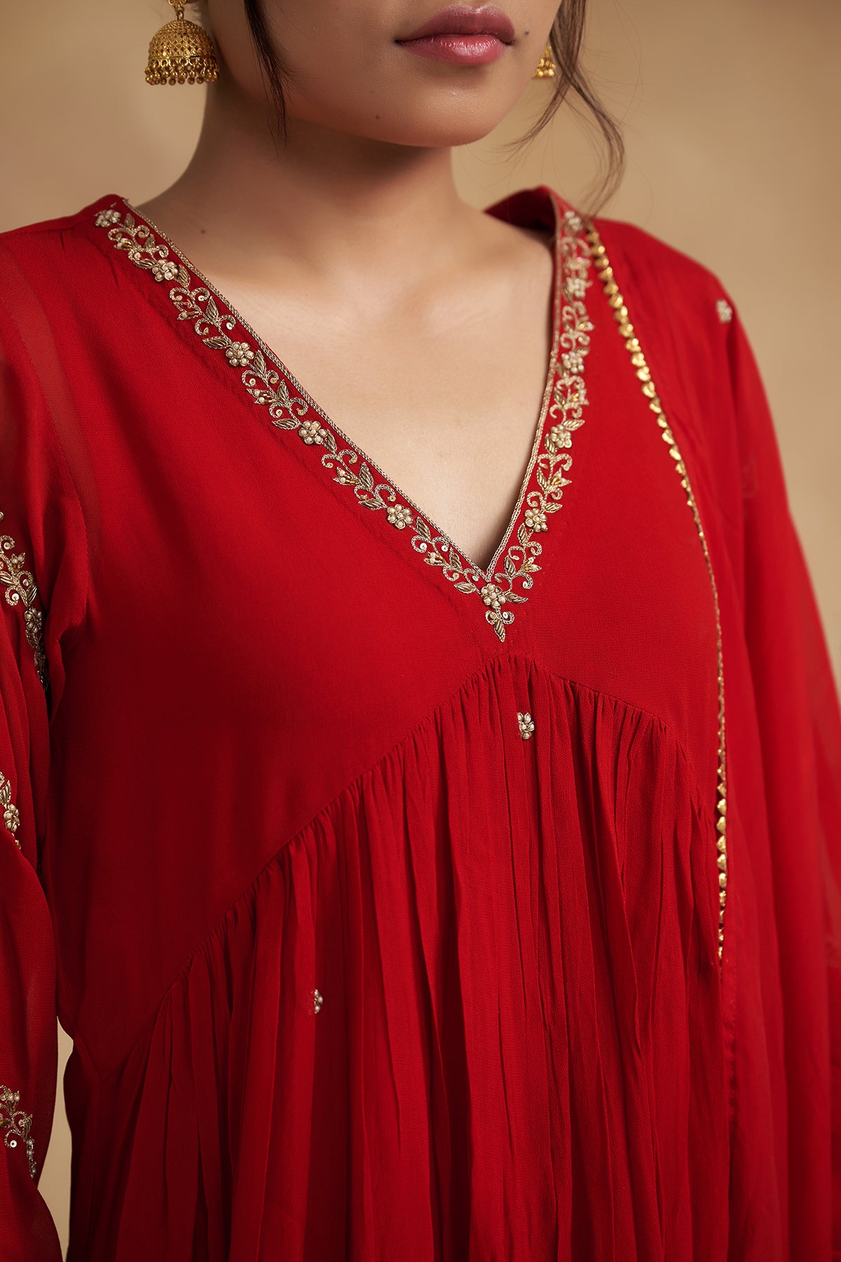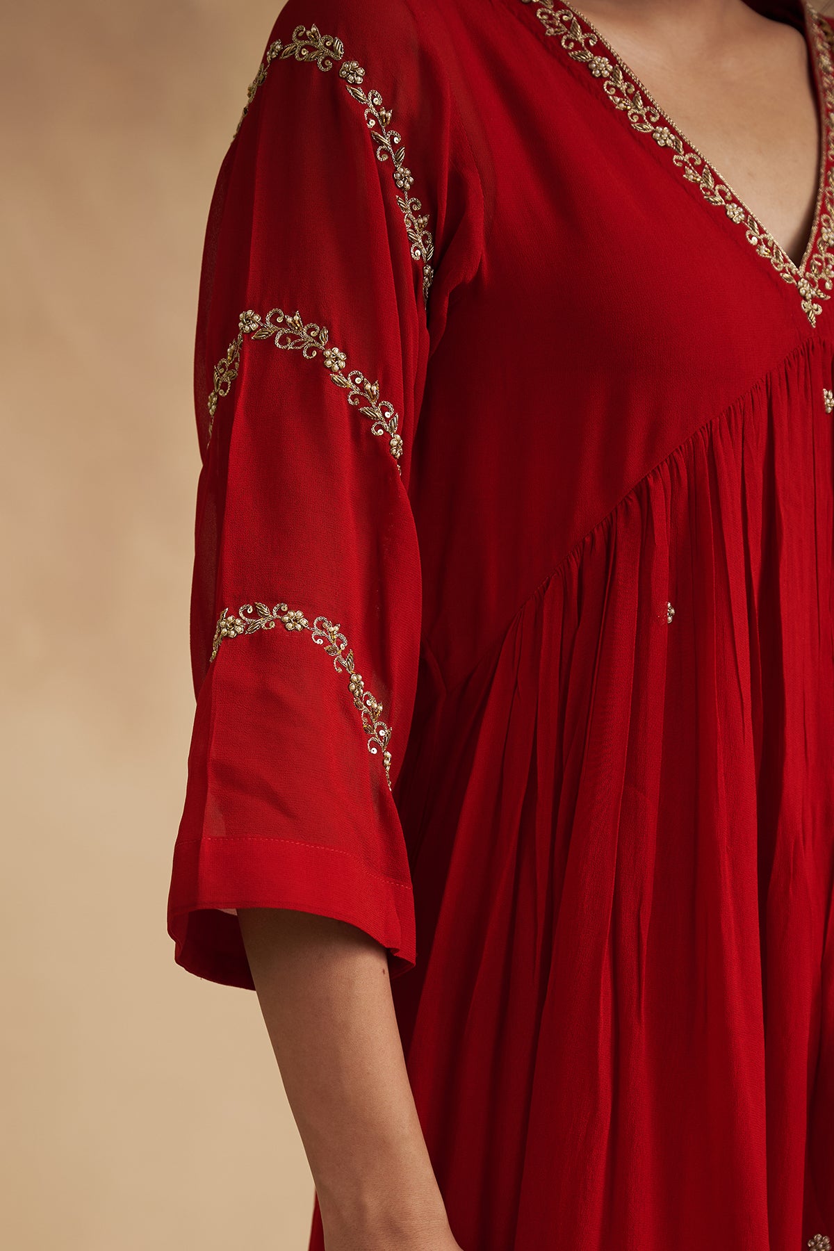 This Georgette suit has detailed embroidery on the front panel and an intricate detailing on the sleeves and around neckline with Zari & Pearls. Dupatta is made of Georgette with scattered sequins work and lace detailing Note: All our dresses come with inner linings or slip.