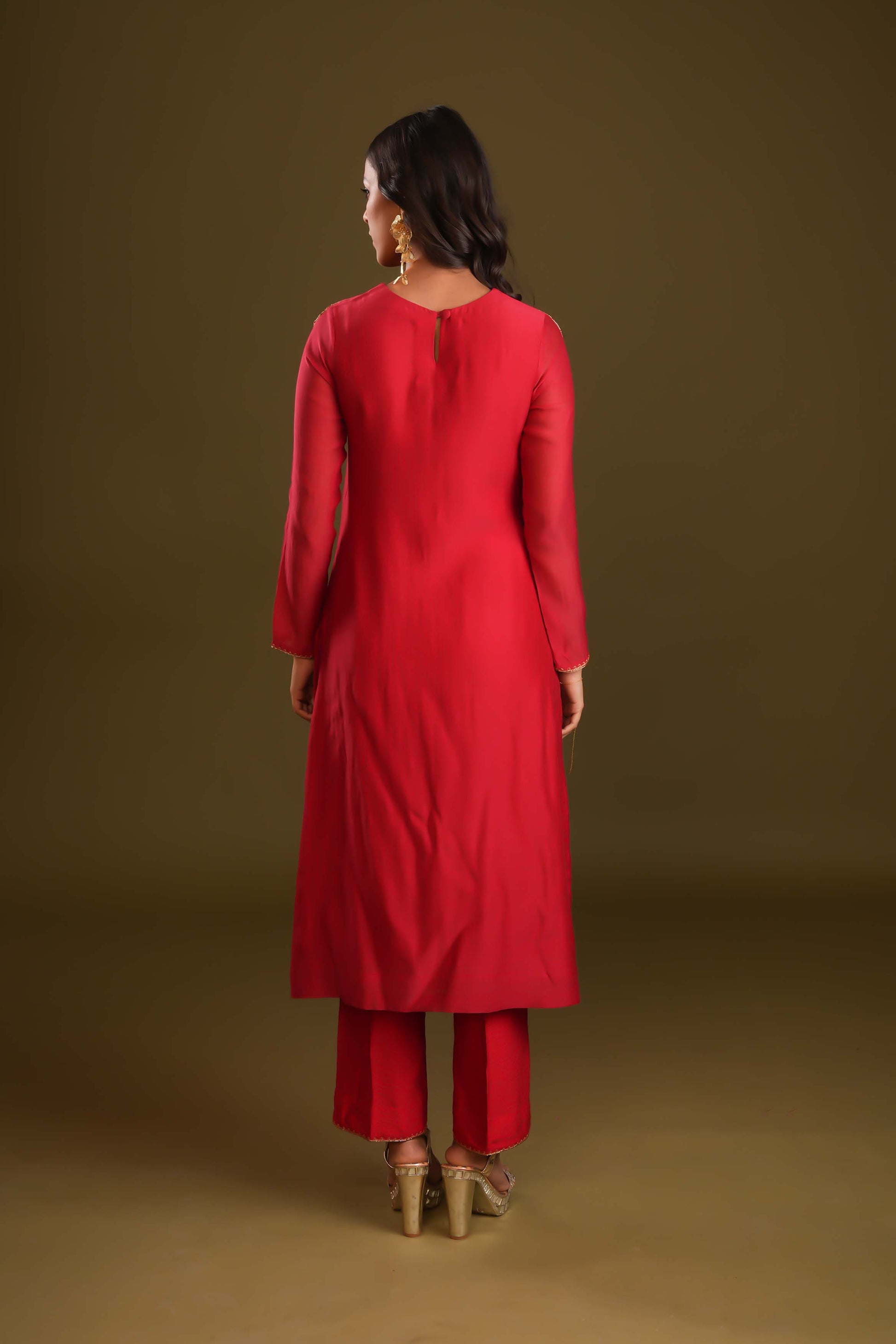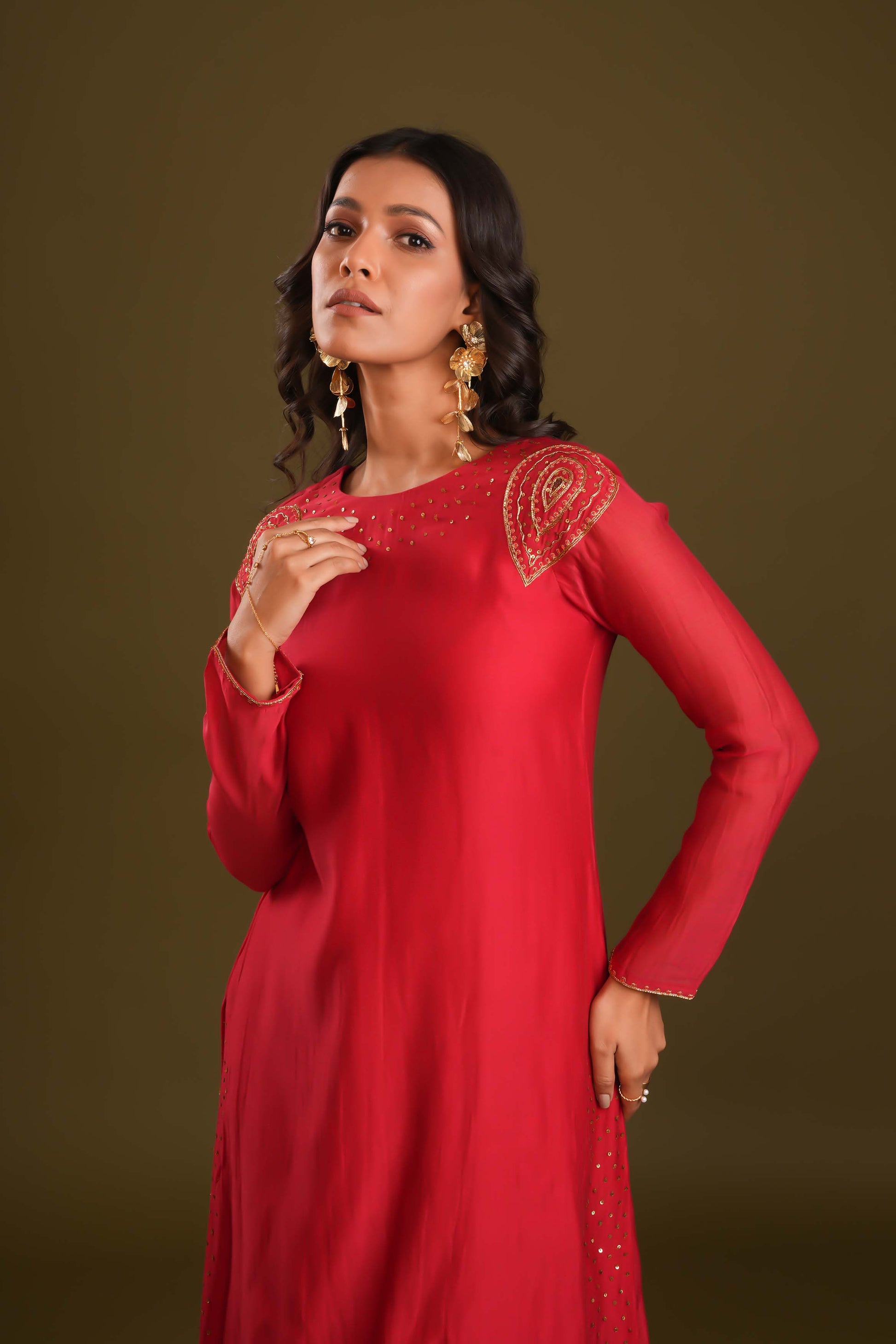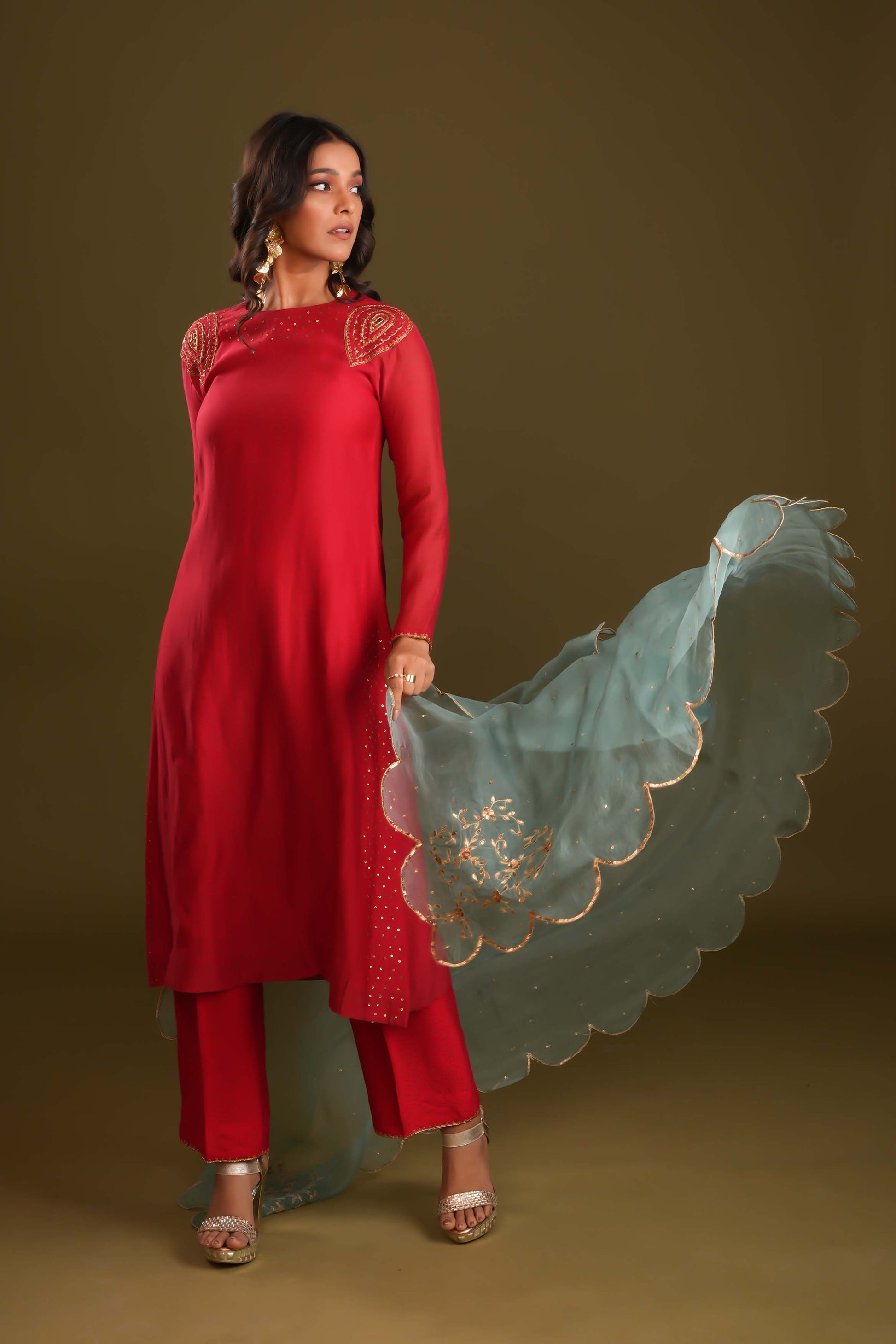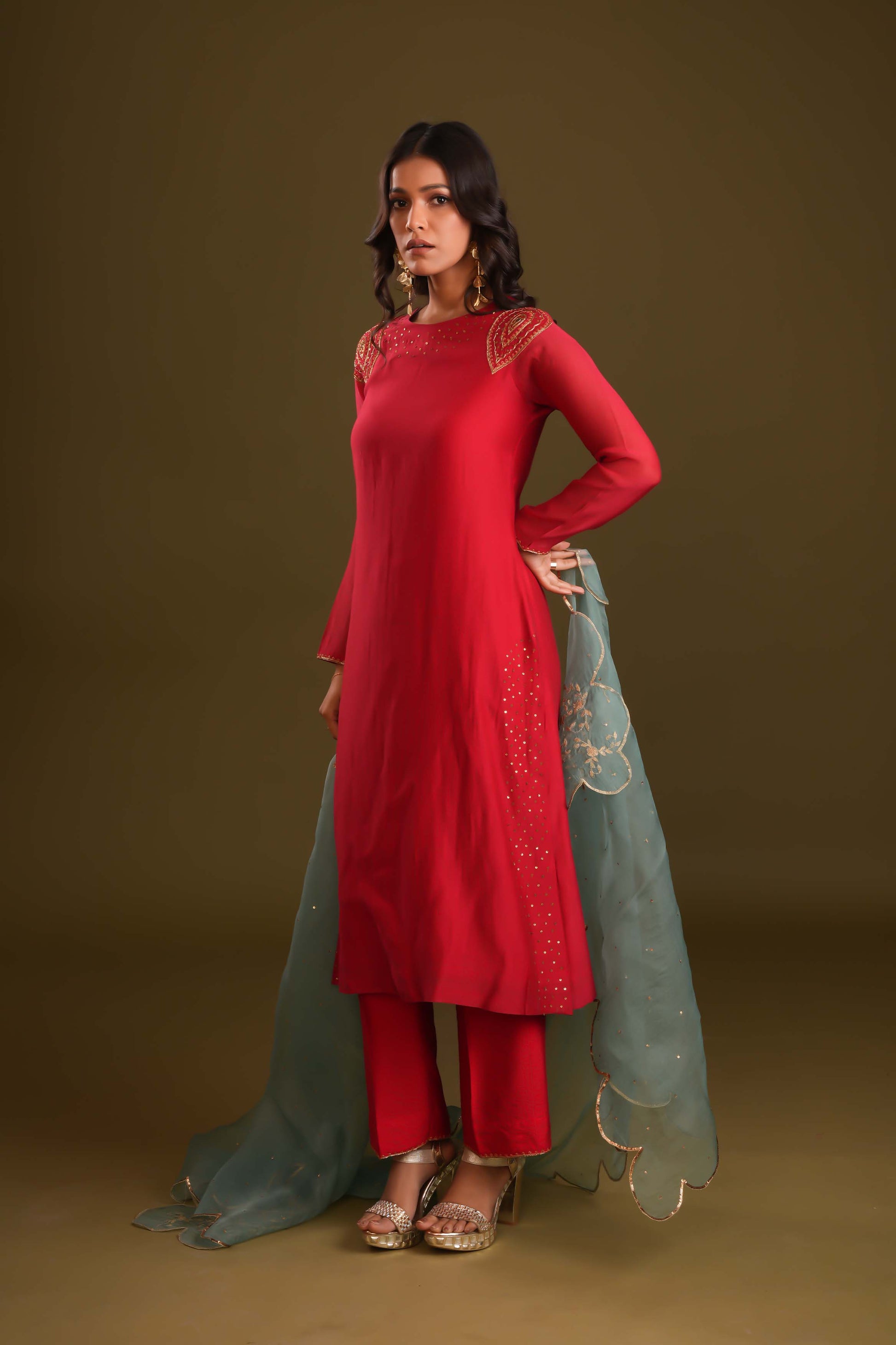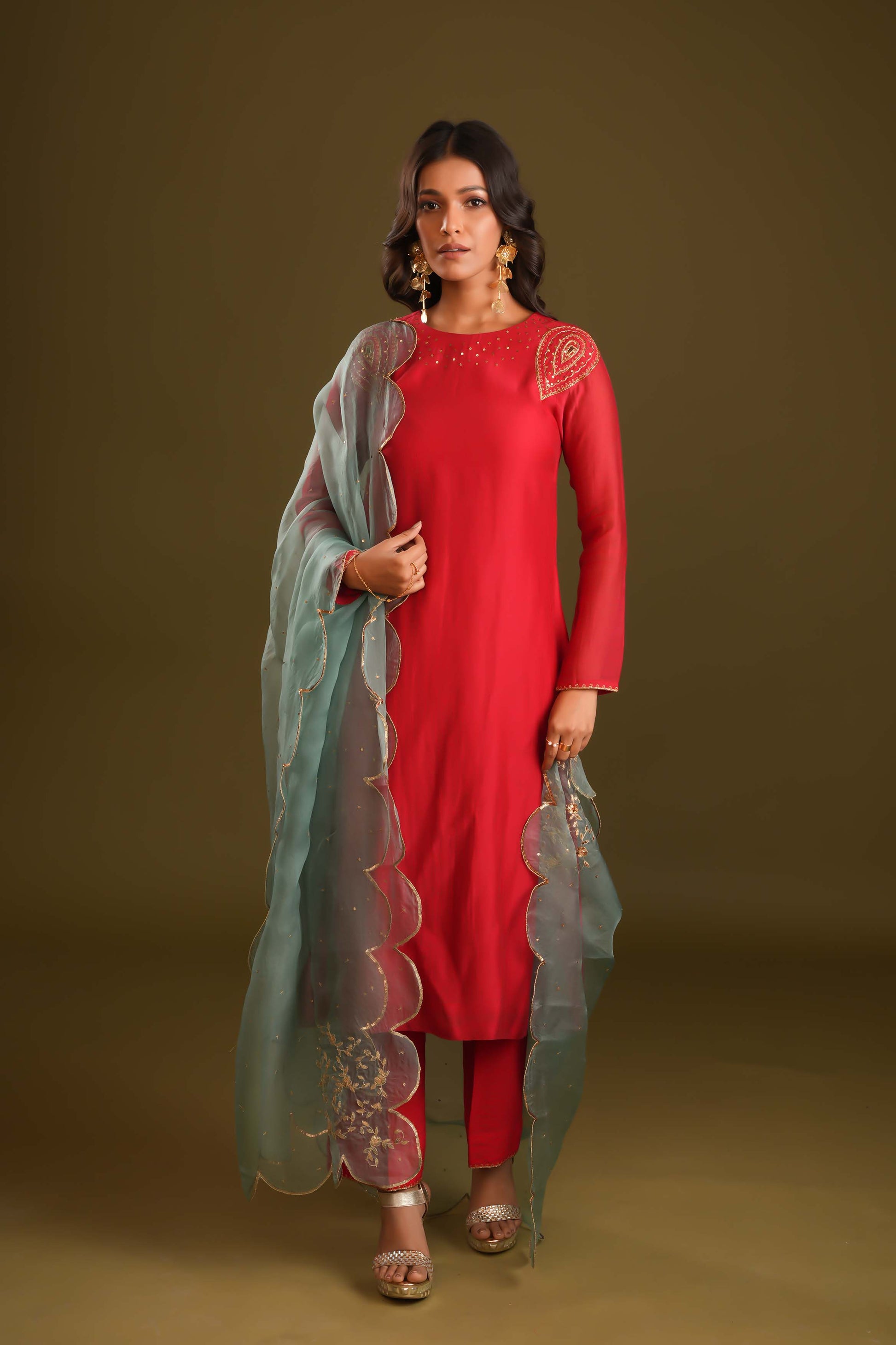 Radiate elegance with this regal red suit and pant set, paired with a striking aqua blue organza dupatta. The dupatta features a scalloped embroidered border and delicate handwork, perfectly complementing the minimal yet intricate detailing of the suit. Statement hand embroidery on the shoulders and sequin chheta work on the chaak elevate its royal appeal. This ensemble is a stunning choice for those seeking timeless sophistication with a touch of modern flair.