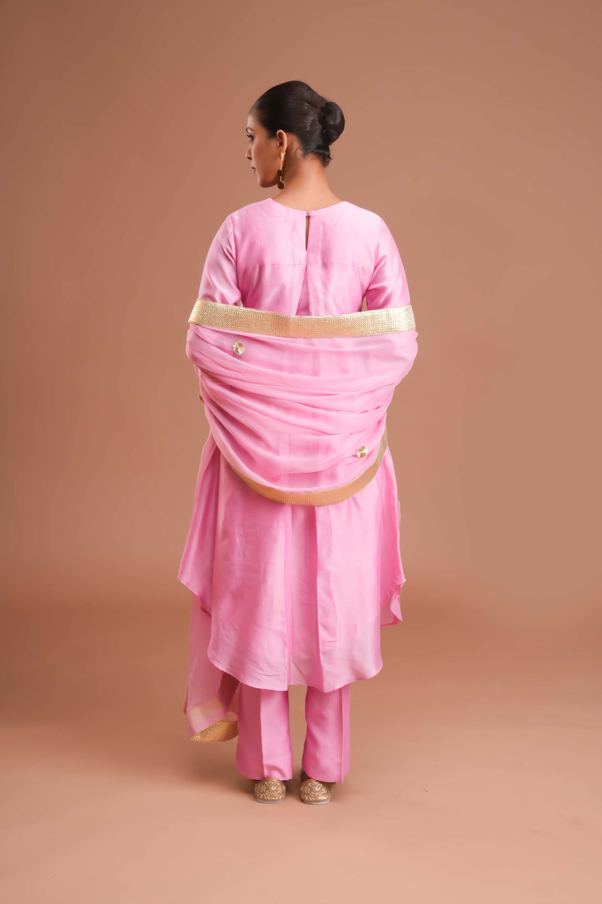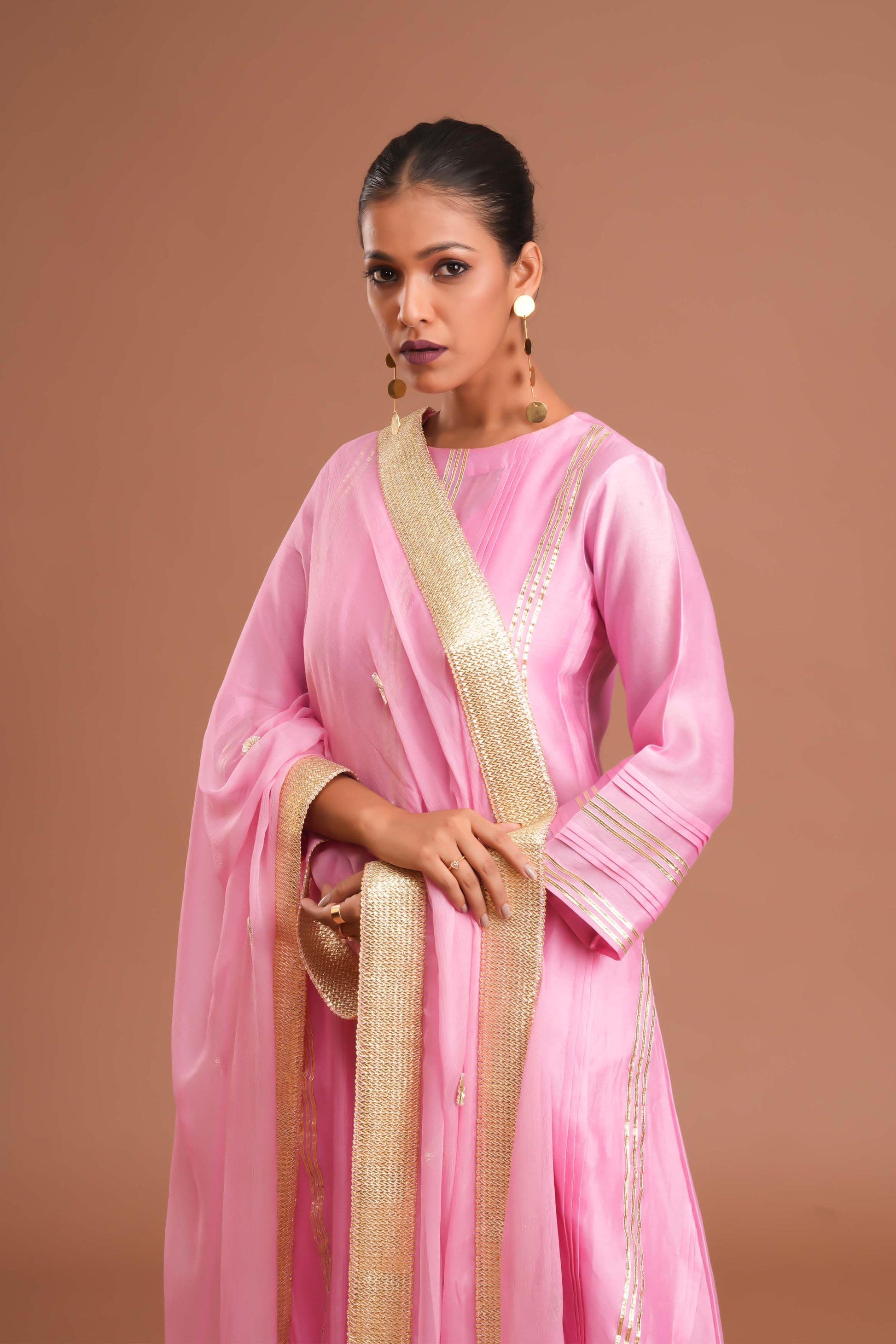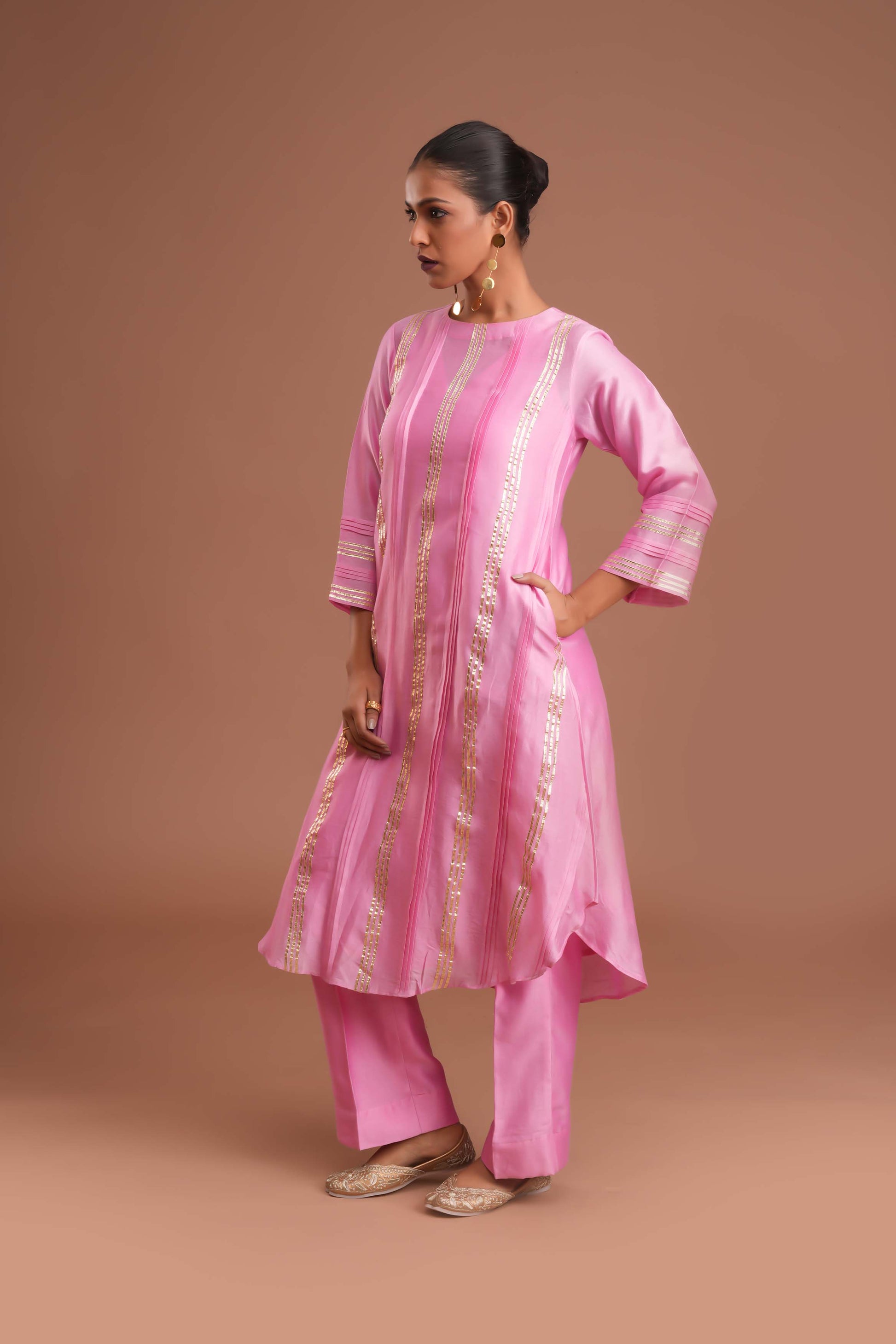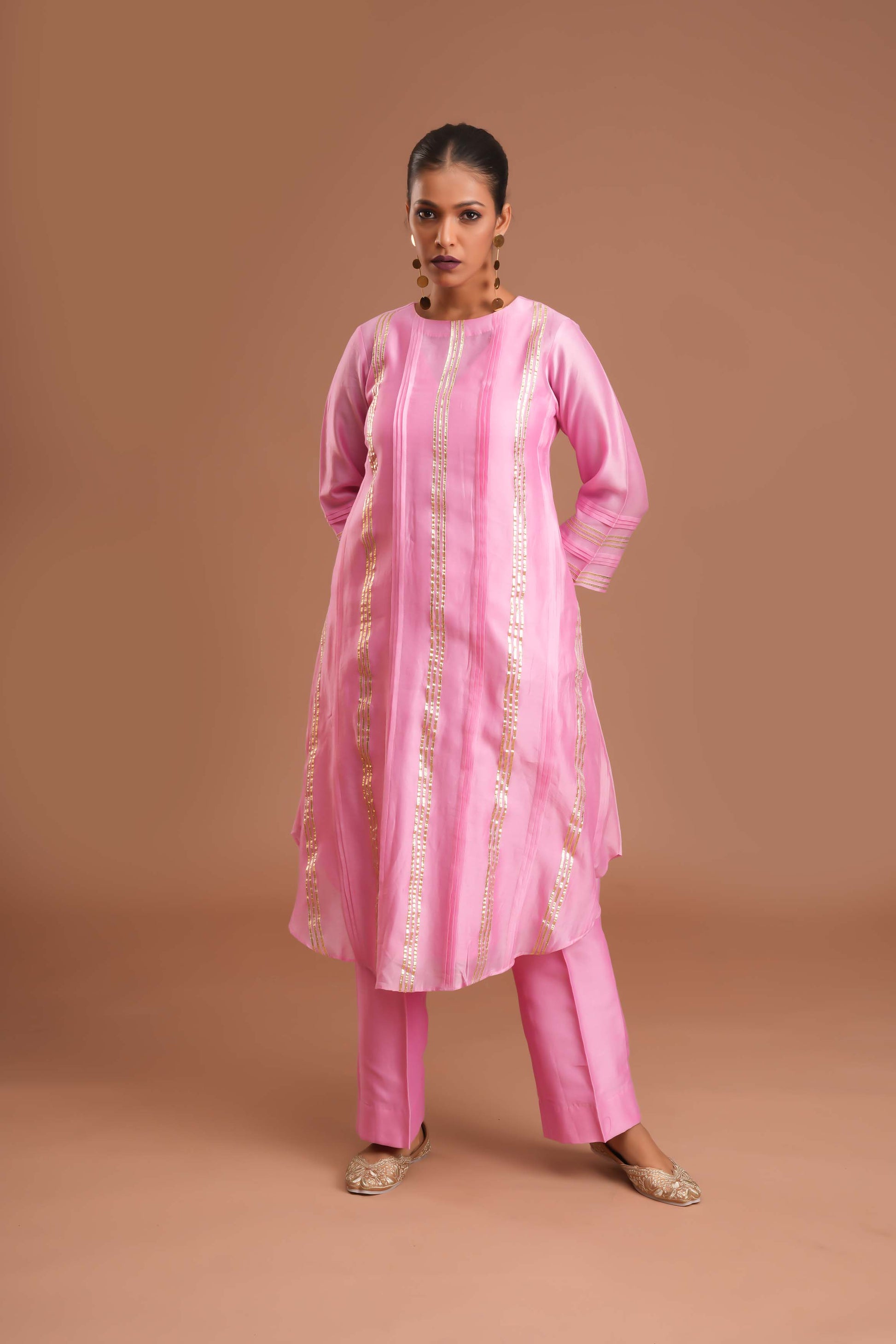 Introducing the Sehaj Suit Set, inspired by the essence of simplicity and the innate elegance of a woman. This enchanting ensemble in soft light pink embodies spontaneity and naturalness, making it a perfect choice for any occasion. Crafted from luxurious pure silk, the suit set features exquisite Rajasthani gota work that adds a touch of traditional artistry to the design. The delicate detailing enhances the overall aesthetic, creating a harmonious balance between elegance and comfort. Celebrate your innate beauty with the Sehaj Suit Set—a timeless piece that reflects the smoothness and ease of femininity.