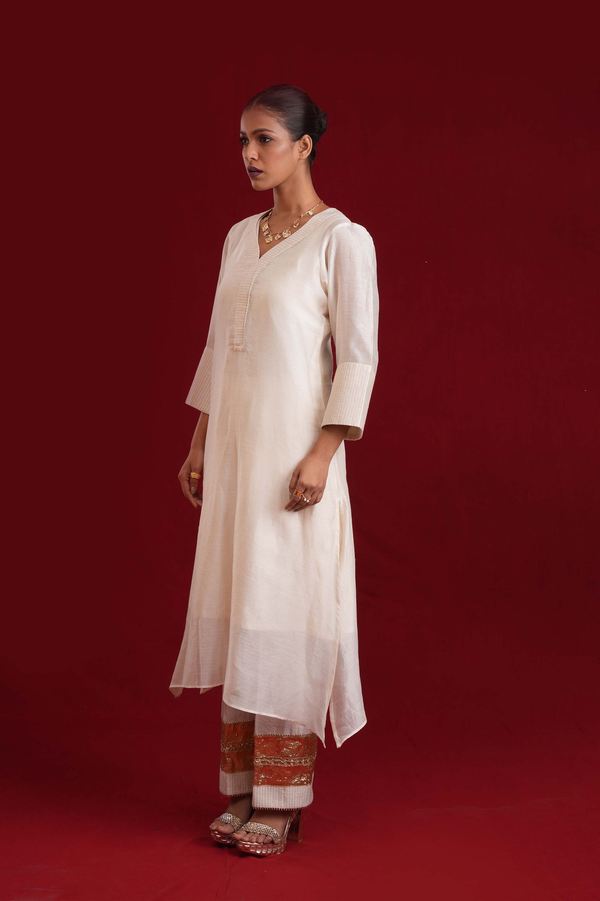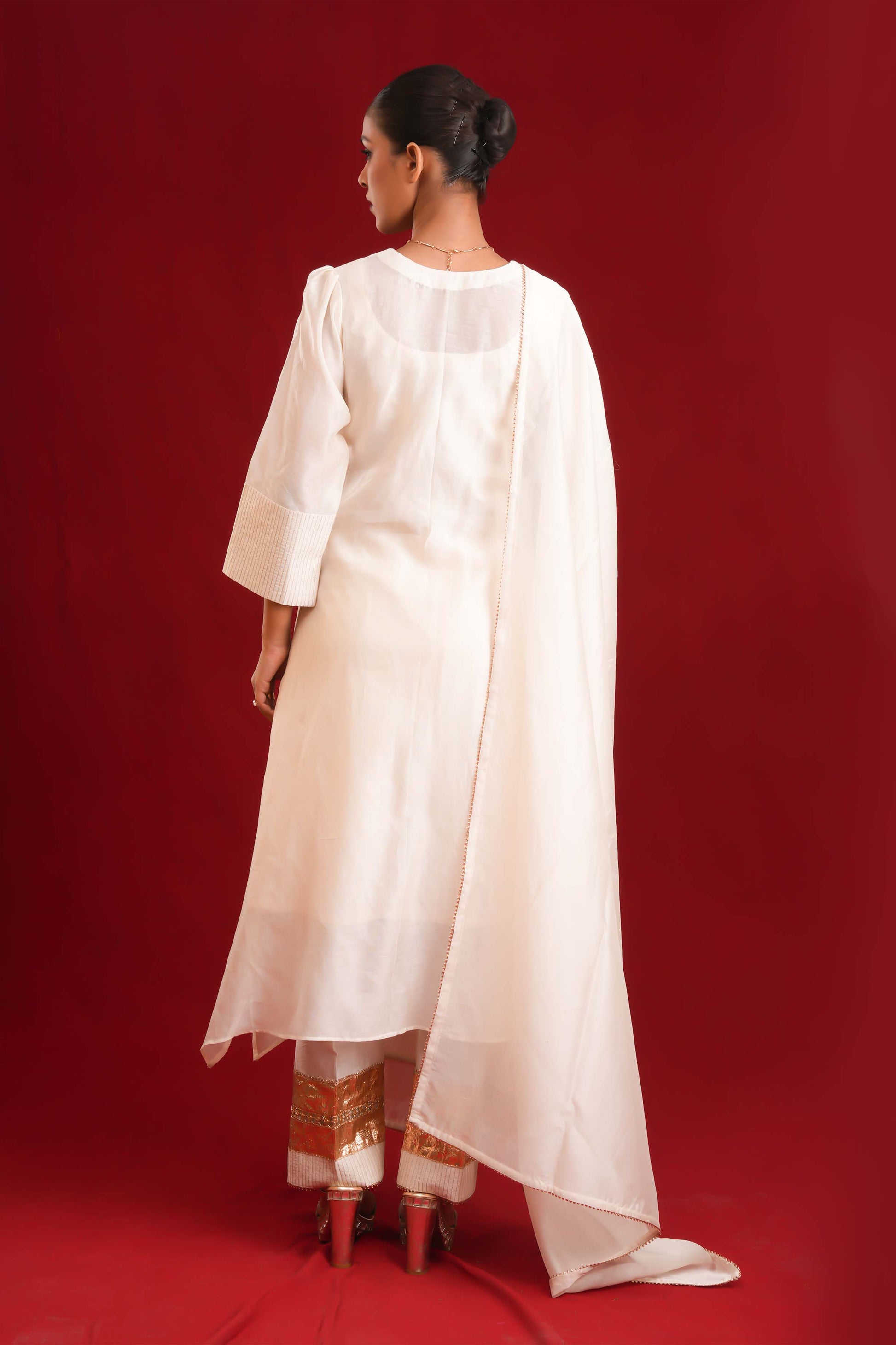 Exude timeless elegance with this off-white A-line suit set, a perfect blend of classic design and intricate craftsmanship. The pants feature broad gota work at the bottom, adding a touch of regal charm, while the ensemble is adorned with delicate zari and gota detailing that enhances its rich, luxurious appeal. Paired with a classic dupatta, this royal piece is ideal for weddings, festive occasions, or any event where you want to make a sophisticated statement.